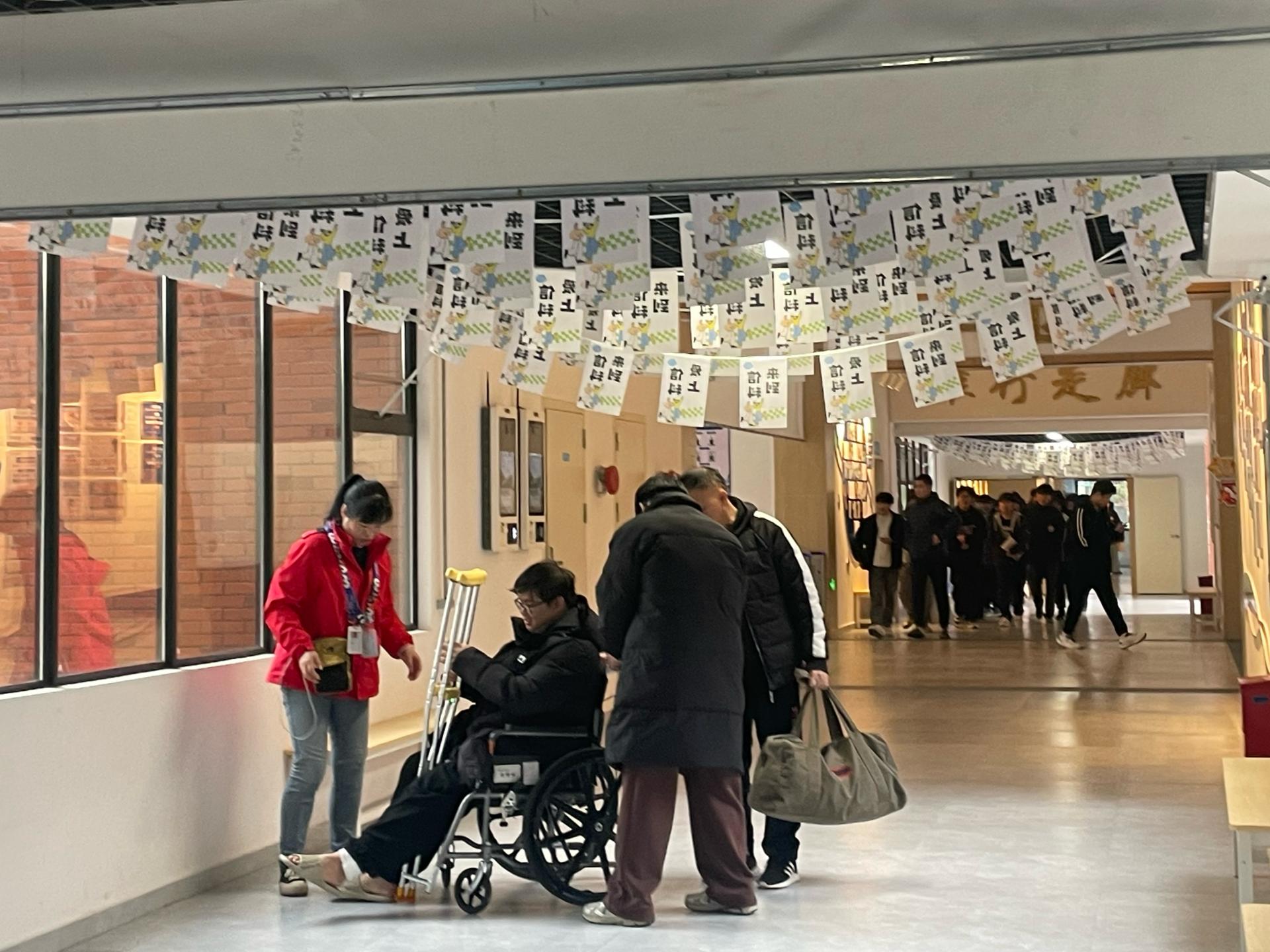 此前,一名学生因腿部手术行动不便,后勤服务处得知后迅速响应,为其安排了距离食堂和教学区最近的崇礼楼一楼的“阳光小屋”无障碍宿舍。同时给学生提供了轮椅、拐杖等辅助设备,并协助其整理床铺。