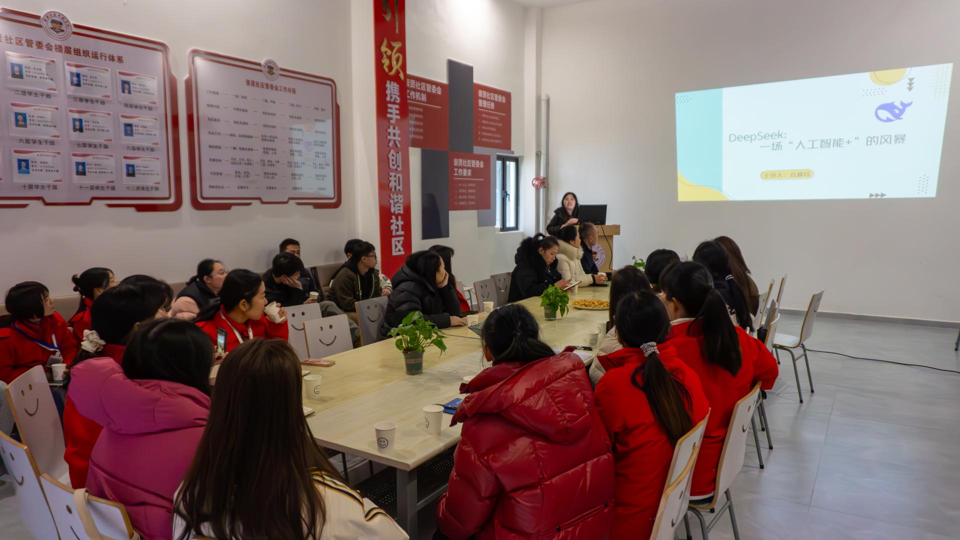 为提升同学们的科技素养,在学生社区内营造学习氛围,帮助学生更好地适应智能化时代。近日,后勤服务处在崇贤楼学生社区活动室组织开展了以“探索AI工具,赋能智慧生活”为主题的社区小课堂活动,后勤服务处相关工作人员以及学生代表参与本次活动。