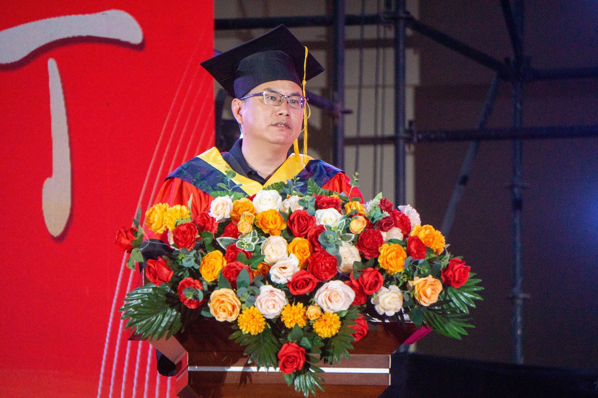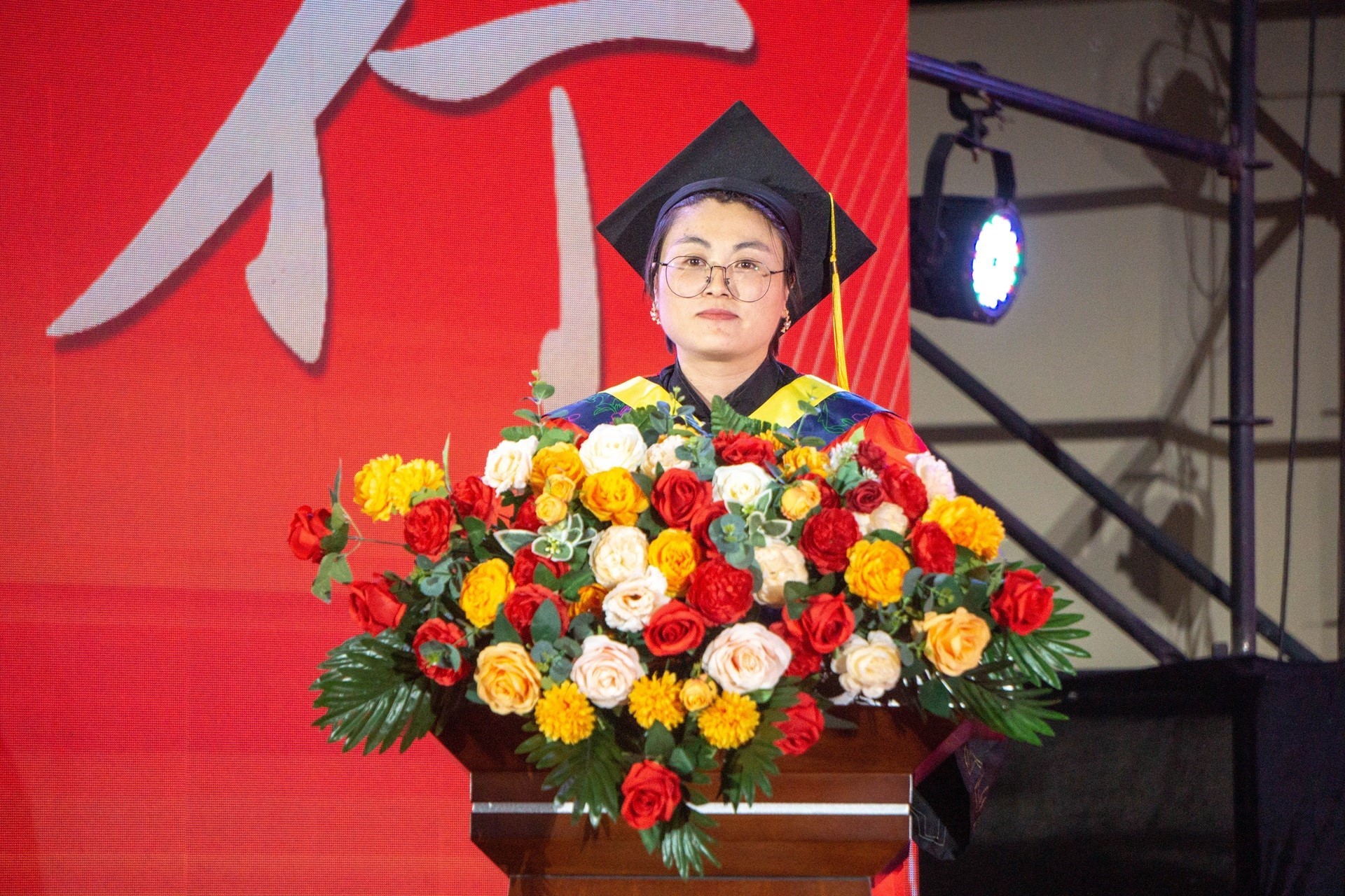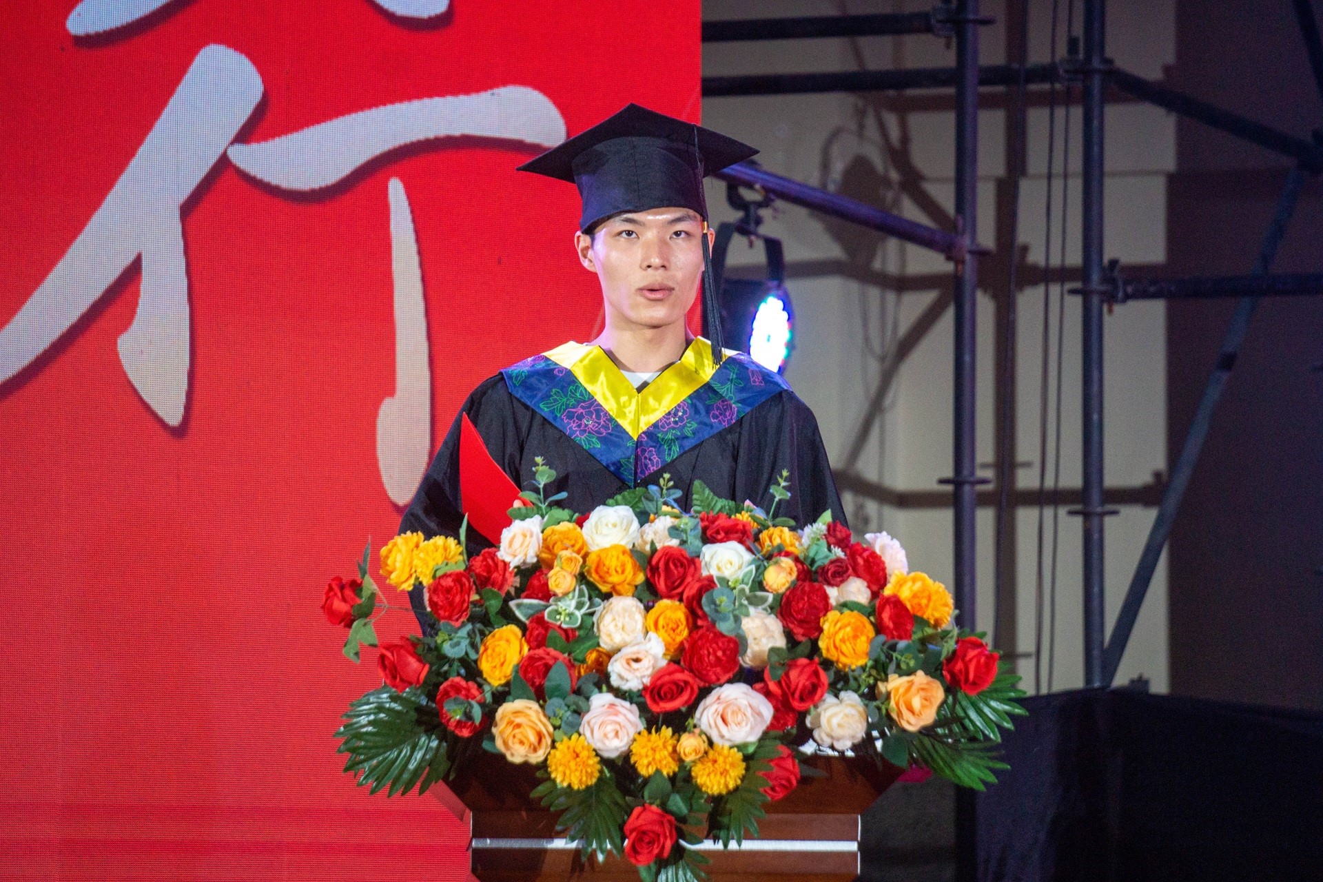 毕业典礼在庄严的国歌奏唱仪式中拉开帷幕。廖老师首先向在场师生及嘉宾隆重介绍了出席典礼的学院领导,并宣读了授予学士学位资格的决定文件。在庄重而温馨的学位授予环节,教师代表们依次为毕业生代表正冠拨穗,郑重颁发学位证书。当学位帽流苏从右前侧移向左前侧的瞬间,现场响起持久热烈的掌声,毕业生们难掩激动与不舍,或与师长深情相拥,或鞠躬致意,用最真挚的肢体语言向母校诉说感恩,向青春岁月作别。