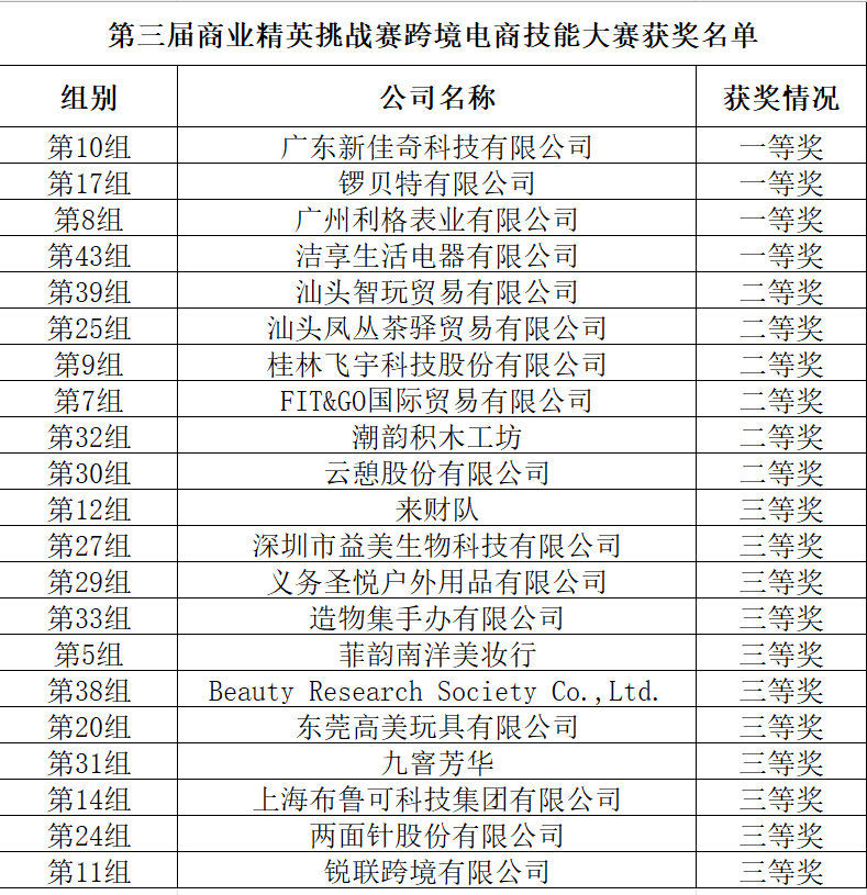 6月19日,pp电子第三届商业精英挑战赛跨境电商技能大赛圆满落幕。本次大赛有43支团队报名参加,各参赛队以企业(模拟出口商)名义参赛,竞赛内容包括选品策划方案和全英文形式的跨境电商新媒体直播。本次评委由外贸与外语学院多位专任教师担任,全方位为参赛选手进行评判。经过激烈角逐,比赛最终产生了4个一等奖,6个二等奖,11个三等奖。具体获奖名单如下图所示。