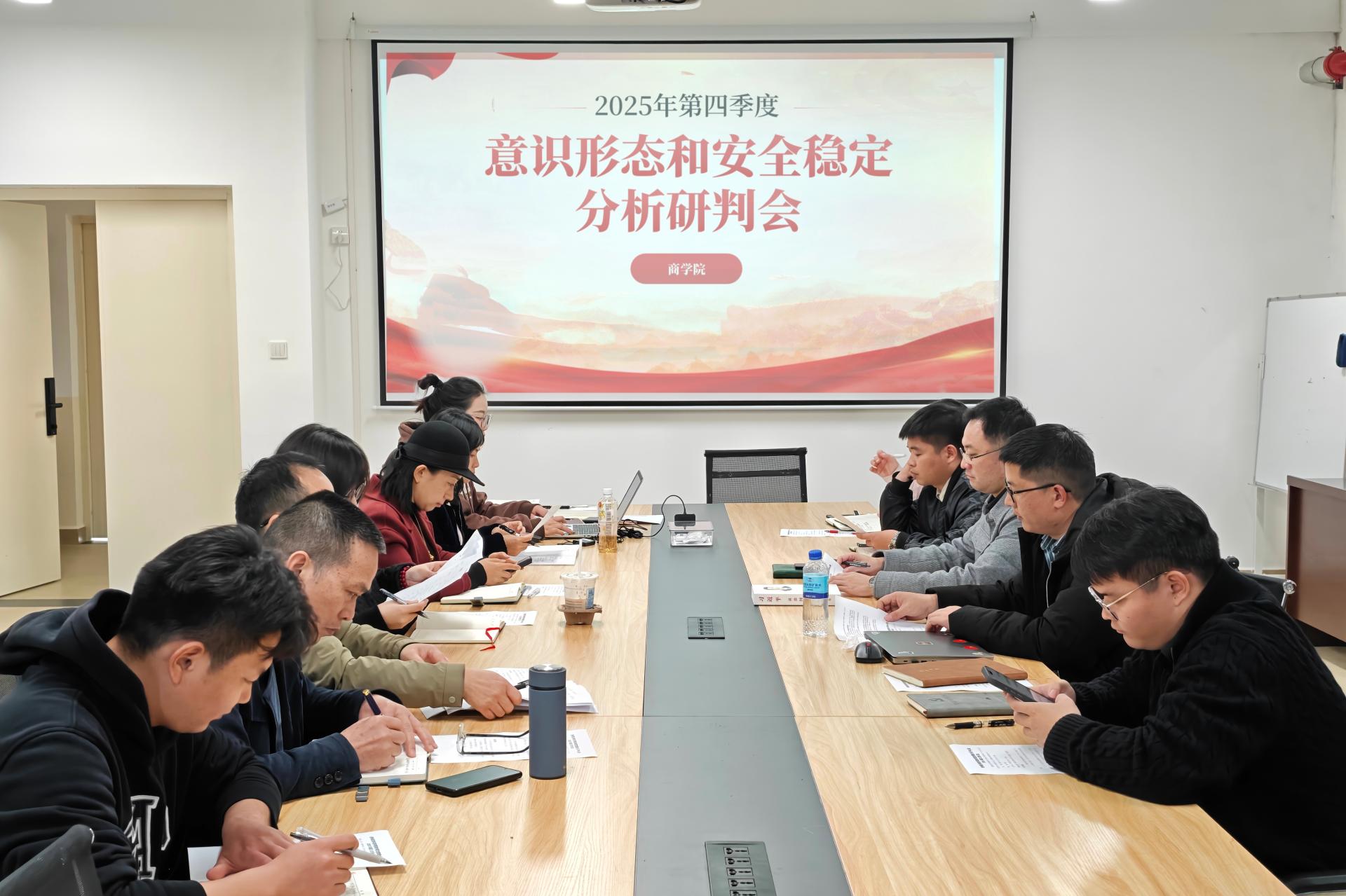 12月19日,商学院在汇通楼H612召开2025年第四季度意识形态和安全稳定分析研判会。学院党委班子成员、各党支部书记及组织员参加会议,党委书记许奇主持会议。