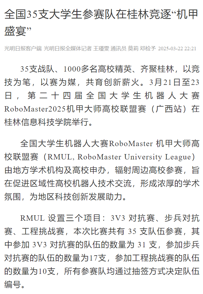 光明日报链接:全国35支大学生参赛队在桂林竞逐“机甲盛宴”
