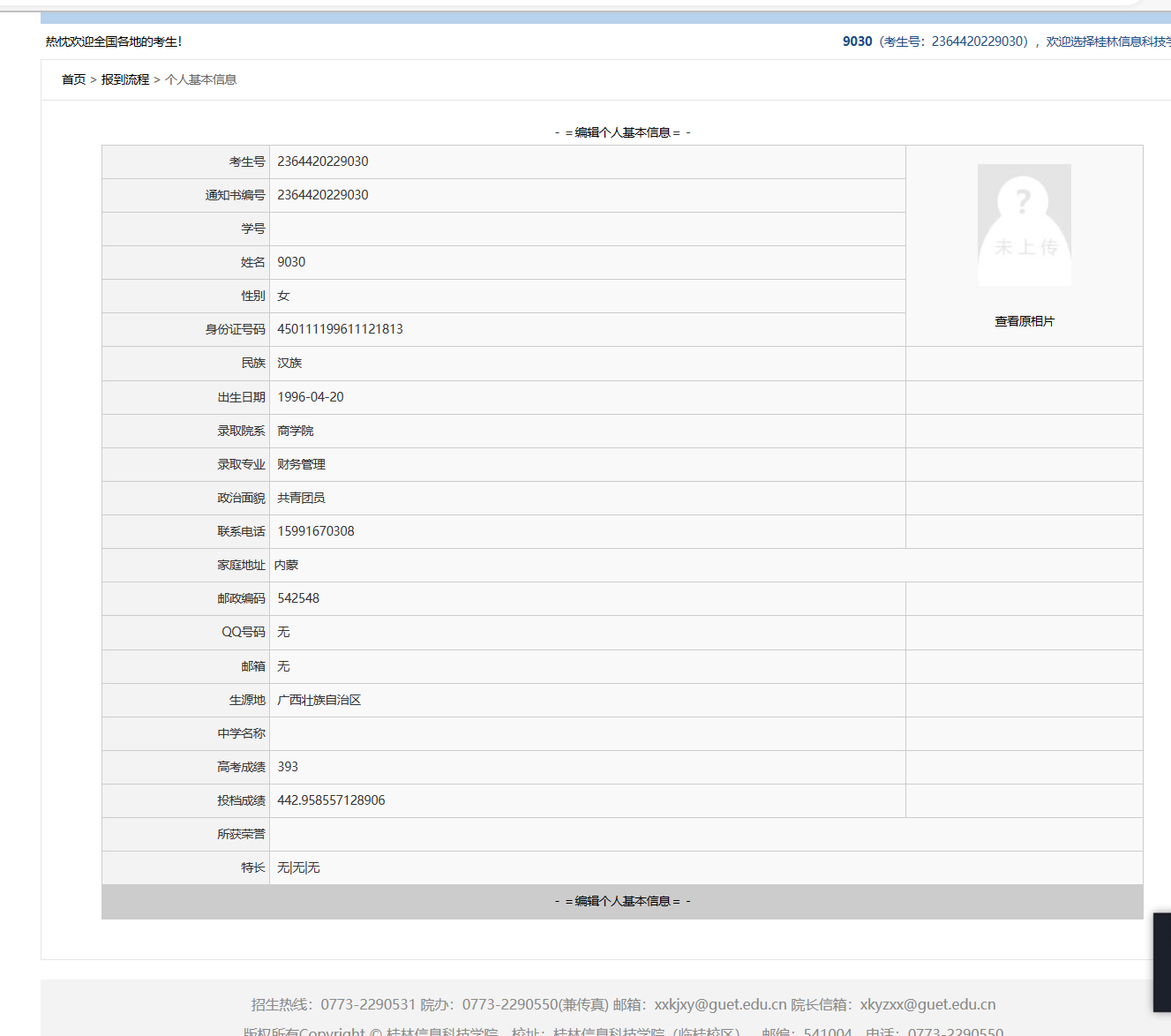 2、用户输入账号、密码及验证码,点击【点击登录系统】按钮,即可登录迎新系统首页。账号为用户高考时的考生号,初始密码为该考生的身份证后8位(如有字母“如X”,请用大写)。迎新系统上方有各模块链接,可点击修改或直接跳转到相应界面。
