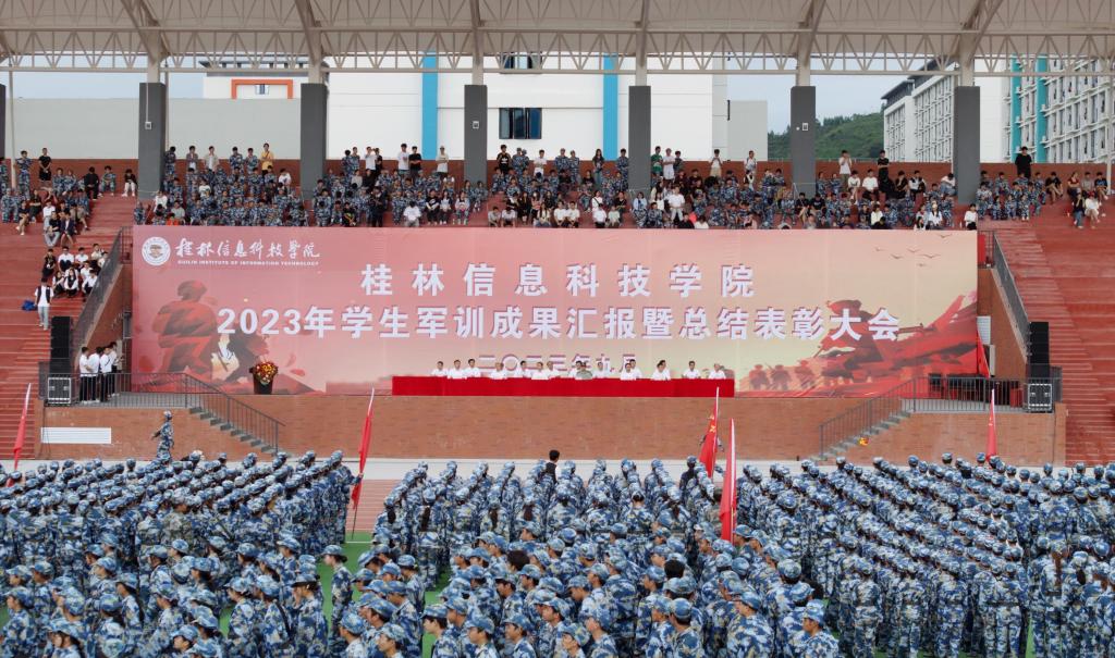 云天收夏色,木叶动秋声。9月22日上午,pp电子2023年军训成果汇报暨总结表彰大会在田径场隆重举行。桂林警备区战备建设处参谋谢钟权中校,学校董事长罗欣,校长梁丁丁,党委书记甘勇,党委副书记、纪委书记李飞,校长助理彭鹏出席大会。学校各教学单位和有关部门负责人、辅导员、在校学生代表及参训的全体学生近一万人共同参加这场载入学校发展史册的大会。大会由彭鹏主持。