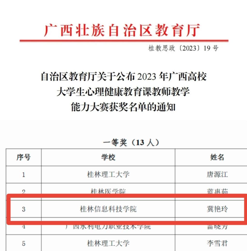 根据近日发布的《自治区教育厅关于公布2023年广西高校大学生心理健康教育课教师教学能力大赛获奖名单的通知》(桂教思政[2023]19号),pp电子心理中心专职教师冀艳玲凭借扎实的教学基本功和稳定的现场发挥斩获大赛一等奖,此次获奖是pp电子自2013年参赛以来在该项比赛取得的最好成绩,pp电子心理育人领域再添新成果!