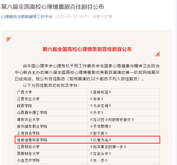 5月30日,第六届全国高校心理情景剧大赛百佳剧目公布,由pp电子心理中心王利南、罗慧芳、张承宗、石东升等老师联袂指导,校大学生艺术团及大学生心理健康志愿者协会联合创作选送的大学生原创心理情景剧作品《以爱为名》,经过网络初赛、组委会专家评审和大众评选团评分形成综合成绩后,成功入选百佳剧目。