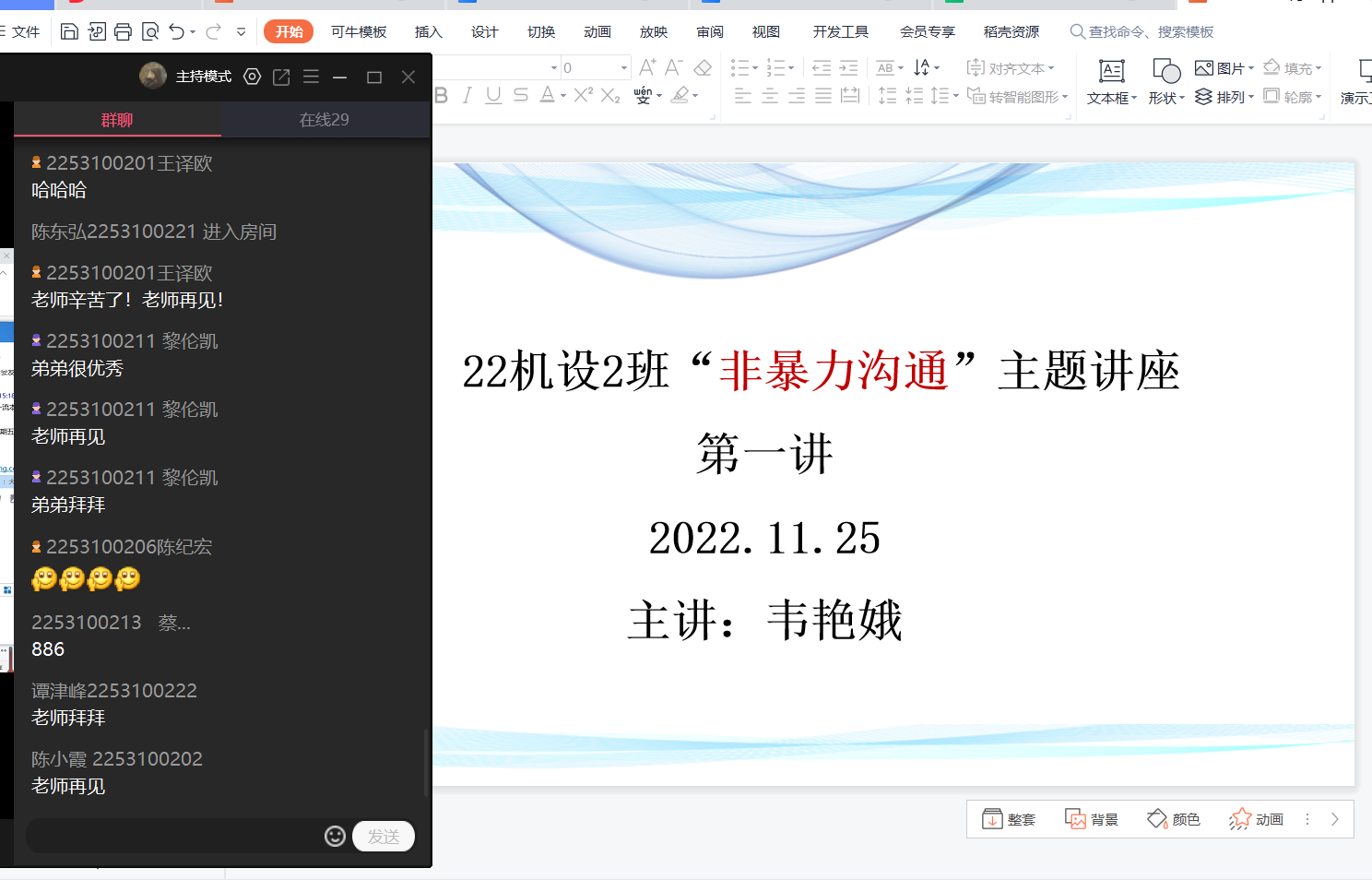 11月25日下午,机电工程学院22531002班班主任韦艳娥老师组织全班同学,在QQ群课堂举办了“非暴力沟通”讲座,完成了“非暴力沟通”讲座的第一讲。