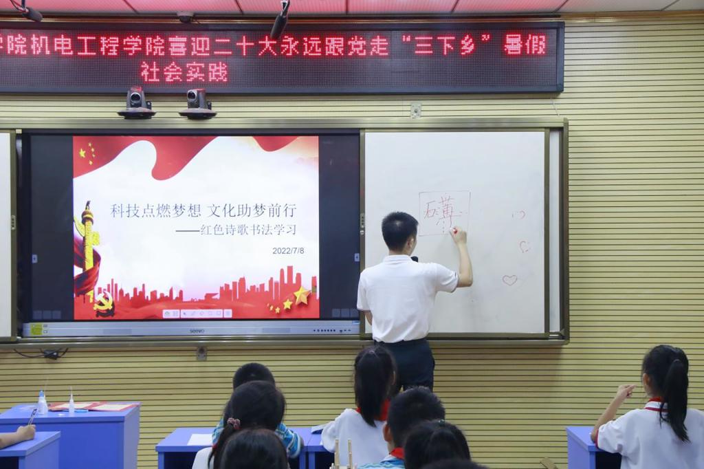 为深入贯彻落实习近平总书记关于“三农”工作的重要论述,发动青年大学生了解认知和积极助力乡村教育的发展状况,7月6日至7月8日,机电工程学院由蒋宇、于凌浩、胡平华、莫荣等指导老师及学生代表组成的“科技梦”实践团赴柘木镇窑头小学开展2022暑期“三下乡”社会实践。