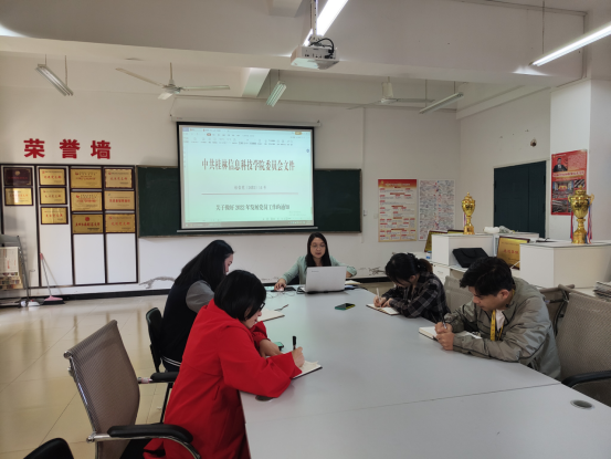 会上,黄娟同志对近期党务工作进行了传达,针对2022年度发展党员工作、毕业生党员组织关系转接工作、学校“青春献礼二十大”主题系列活动进行部署。她指出,各党支部要切实提高政治站位,担负起教育、管理、监督党员和组织、宣传、凝聚、服务群众的重要职责,树立党员的良好风貌;各党支部要正确认识支部与学院的发展关系,充分抓住学院专业特点,创新开展支部“三会一课”工作、“主题党日”活动,创新组织生活形式,提高工作水平;各支部书记要关心党员同志,切实做到关心支部每位党员的工作生活情况,帮助解决困难和问题,加强支部的凝聚力和战斗力,要严格按照支部书记的岗位职责要求,规规矩矩完成各项任务目标。