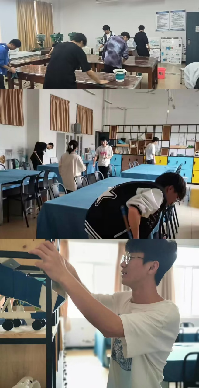 在此期间,22级工业设计专业的同学们分工明确,从擦桌子、擦窗户,到扫地、拖地,再到整理桌椅书柜,各个环节都有专人认真负责,秩序井井有条,呈现了团结协作,努力工作的良好氛围。