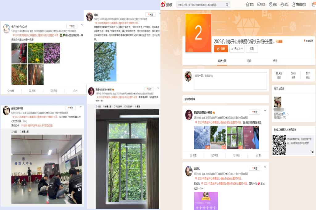 为了教育引导大学生树立团结友爱、互帮互助、携手共进的意识,培育大学生自尊自信、理性平和、积极向上的健康心态,5月1日-5月15日,机电工程学院在新浪微博超话区开展“ 敞开心扉,美丽心情,快乐成长”主題14天美丽心情打卡活动,参与活动面对象为全院学生。