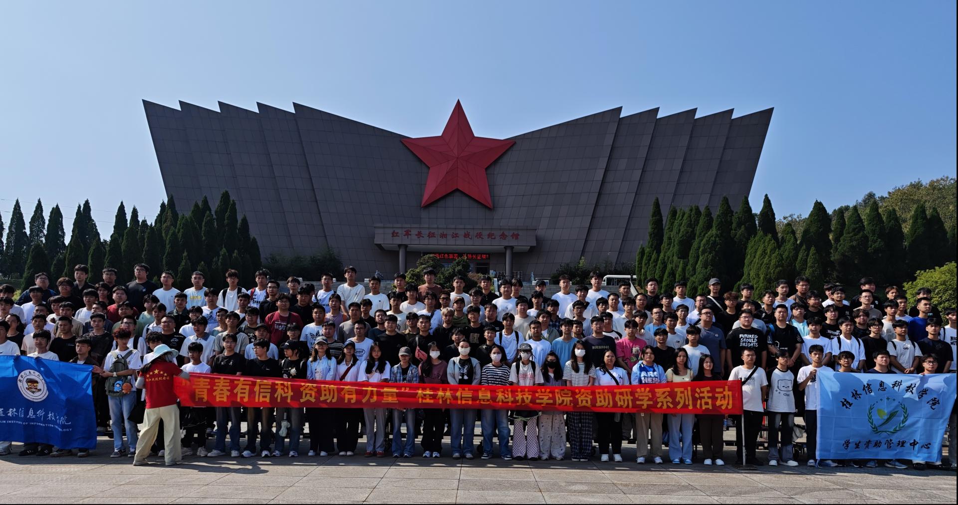 湘江之畔,红军长征湘江战役纪念馆以 “展翅雄鹰” 般的建筑形态与醒目的红星设计,成为传承红色记忆的精神堡垒。学生们在馆前集体合影,定格与历史对话的瞬间;步入馆内,珍贵文物、翔实史料与生动场景还原。随着讲解员的深情讲述,红军将士 “绝命后卫师” 的铁血担当、“断肠明志” 的忠诚气节缓缓铺展,学生们凝视着锈迹斑斑的枪械与布满弹孔的旗帜,耳边仿佛回荡着冲锋号角与不屈呐喊,深刻读懂 “三年不饮湘江水,十年不食湘江鱼” 背后的悲壮与坚韧。离开纪念馆后,师生一行前往毛竹山,在林间围坐开展红色故事分享会,大家将资助政策带来的成长机遇与革命先辈困境中坚守信念的精神相联结,立志以知识为帆、信念为桨,在人生航道上奋勇前行。