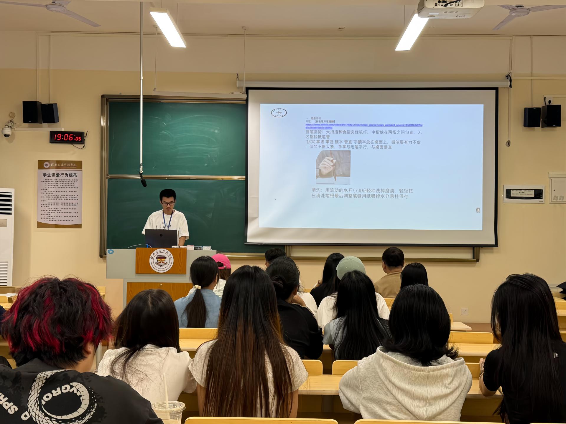本次体验课由校书法协会教学部核心成员主讲,课程以 “知识性 + 专业性 + 实践性” 为核心,分三大环节层层递进。理论讲解阶段,主讲团队围绕 “汉字书体演变脉络”,系统梳理从殷商甲骨文、两周金文到秦代小篆、汉代隶书,再到魏晋楷书、行书、草书的发展历程,结合碑帖图片与历史背景,解读不同书体的艺术特征,帮助学员建立书法史宏观认知;技法教学聚焦汉代隶书经典《曹全碑》,通过实物示范与投影展示,拆解 “蚕头燕尾”“一波三折” 的笔法精髓,演示基本笔画的起笔、行笔、收笔技巧,分析碑帖 “秀丽典雅、舒展飘逸” 的结构特点;实践临摹环节,学员们铺纸研墨、执笔书写,主讲团队巡回指导,针对 “横画起笔不准”“字形松散” 等问题提供个性化建议,现场墨香氤氲,交流探讨声不断,形成 “乐学、善学、互学” 的浓厚氛围。