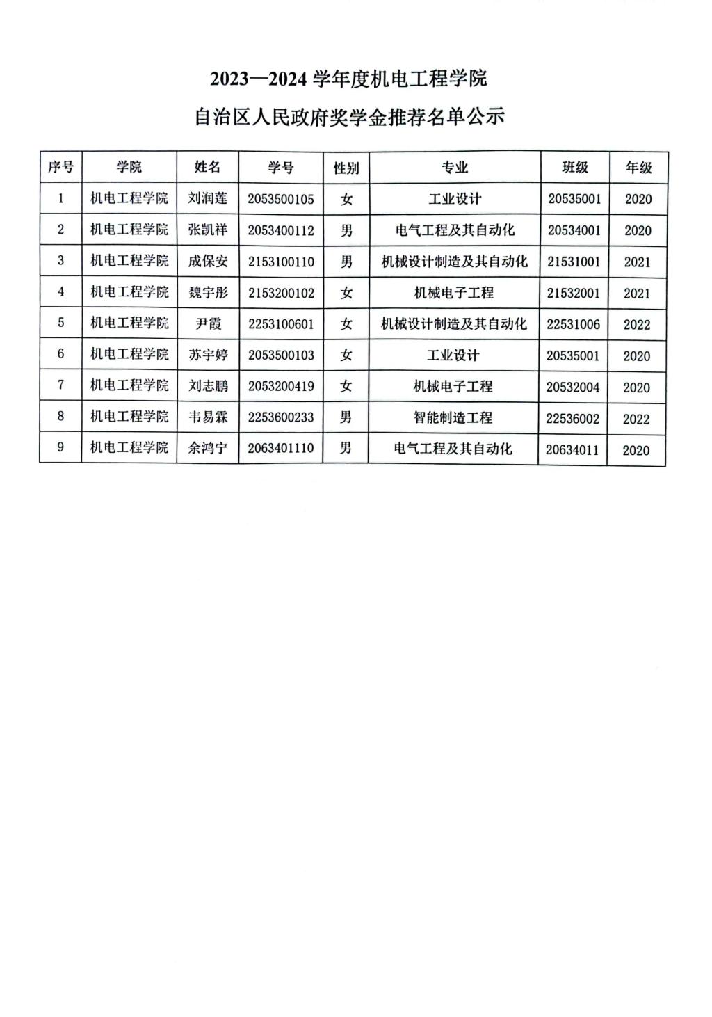 根据《关于做好2023-2024学年度普通高等学校区人民政府奖学金评选工作的通知》的有关规定,本着公平、公正、公开的原则,经个人申报,学院评议,现初步确定推荐刘润莲等9名同学参评2023--2024学年度自治区人民政府奖学金,现将名单予以公示,具体名单详见附件。(排名不分先后)