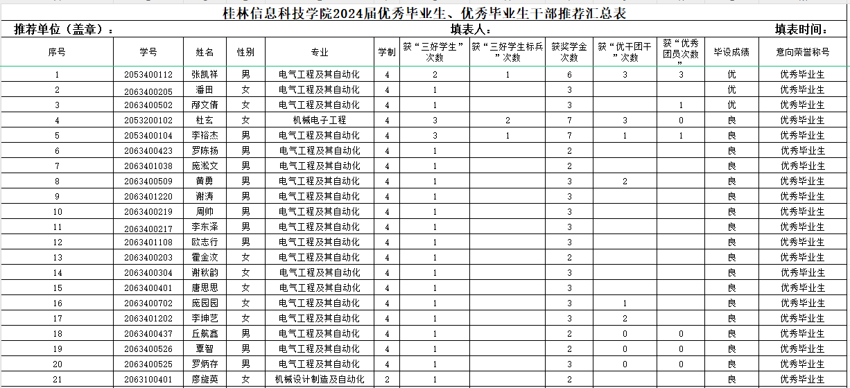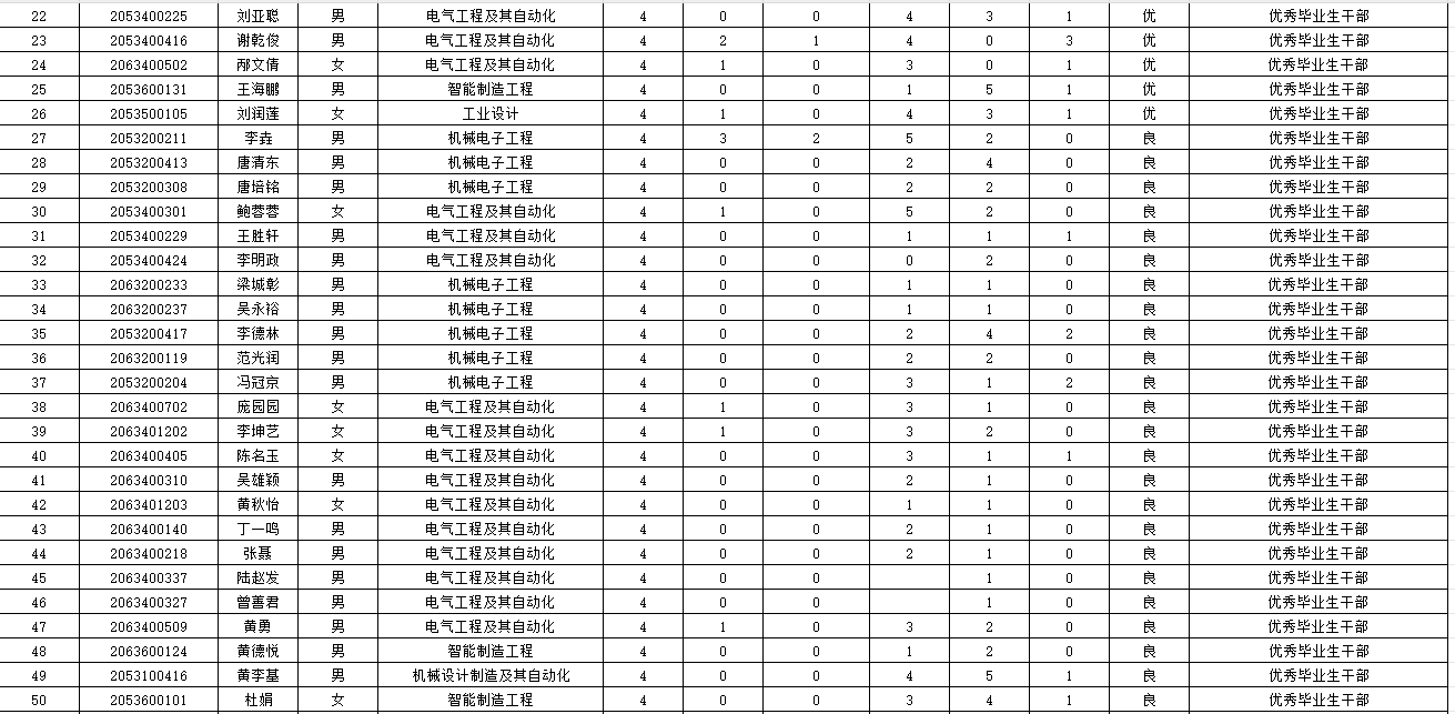 根据校优秀毕业生、校优秀毕业生干部相关评奖条件,本着公平、公正、公开的原则,经学生个人申请,学院评审,现拟推荐张凯祥等21位同学为机电工程学院校优秀毕业生候选人,刘亚聪等38位同学为机电工程学院校优秀毕业生干部候选人具体学生名单公示如下,公示期3天(2024年6月7日至6月9日)。如有异议,请向辅导员反馈。