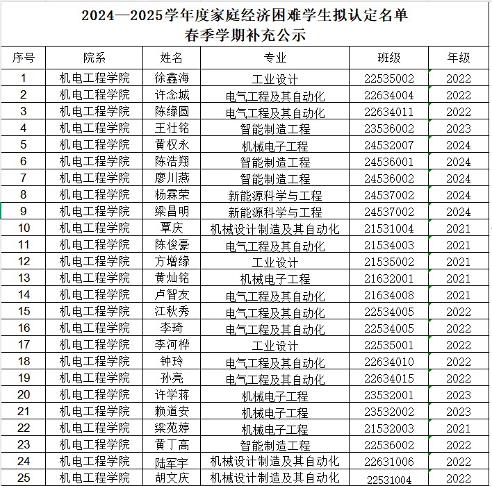 根据《关于做好2024-2025学年度普通高等学校国家助学金评选工作的通知》的有关规定,本着公平、公正、公开的原则,经个人申报,学院评议,现拟认定徐鑫海等25名同学为2024-2025学年度新增家庭经济困难学生。具体名单详见附件(排名不分先后)