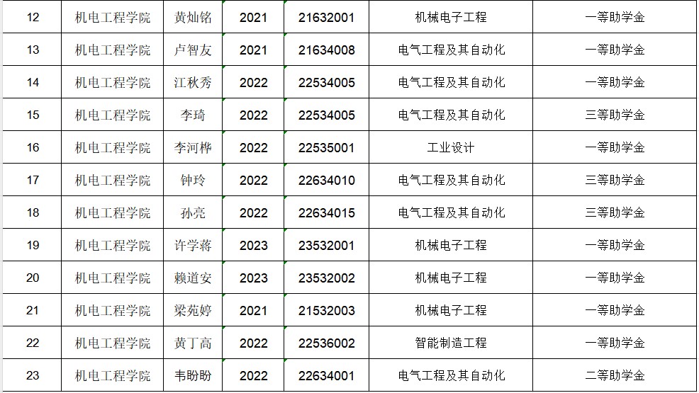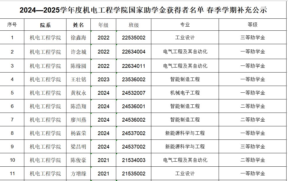 根据《关于做好2024-2025学年度普通高等学校国家助学金评选工作的通知》的有关规定,本着公平、公正、公开的原则,经个人申报,学院认定、审核,现将2024—2025学年度机电工程学院国家助学金获得者春季学期补充名单予以公示。具体名单详见附件。(排名不分先后)