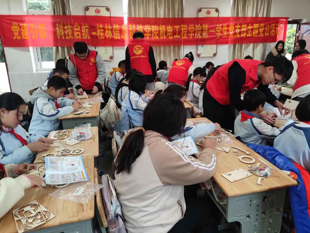 活动伊始,严继玲老师宣读此次活动的内容及意义,紧扣主题“党建引领,科技启航”。桂林市龙门中心校谭凌强副校长对支部党员的到来表示热烈的欢迎及衷心的感谢。接着,机电工程协会和支部党员先后带领小朋友们安全有序的进行了科技作品展览——六爪机器人、流水灯广州塔;现场制作机电工程学院全区青少年科技运动会第一名项目“铁丝陀螺比久”作品;支部党员指导小学生组装手摇发电机、人造卫星模型。小学生们对展示的作品及手工组装制作兴趣盎然,现场气氛热烈活跃。