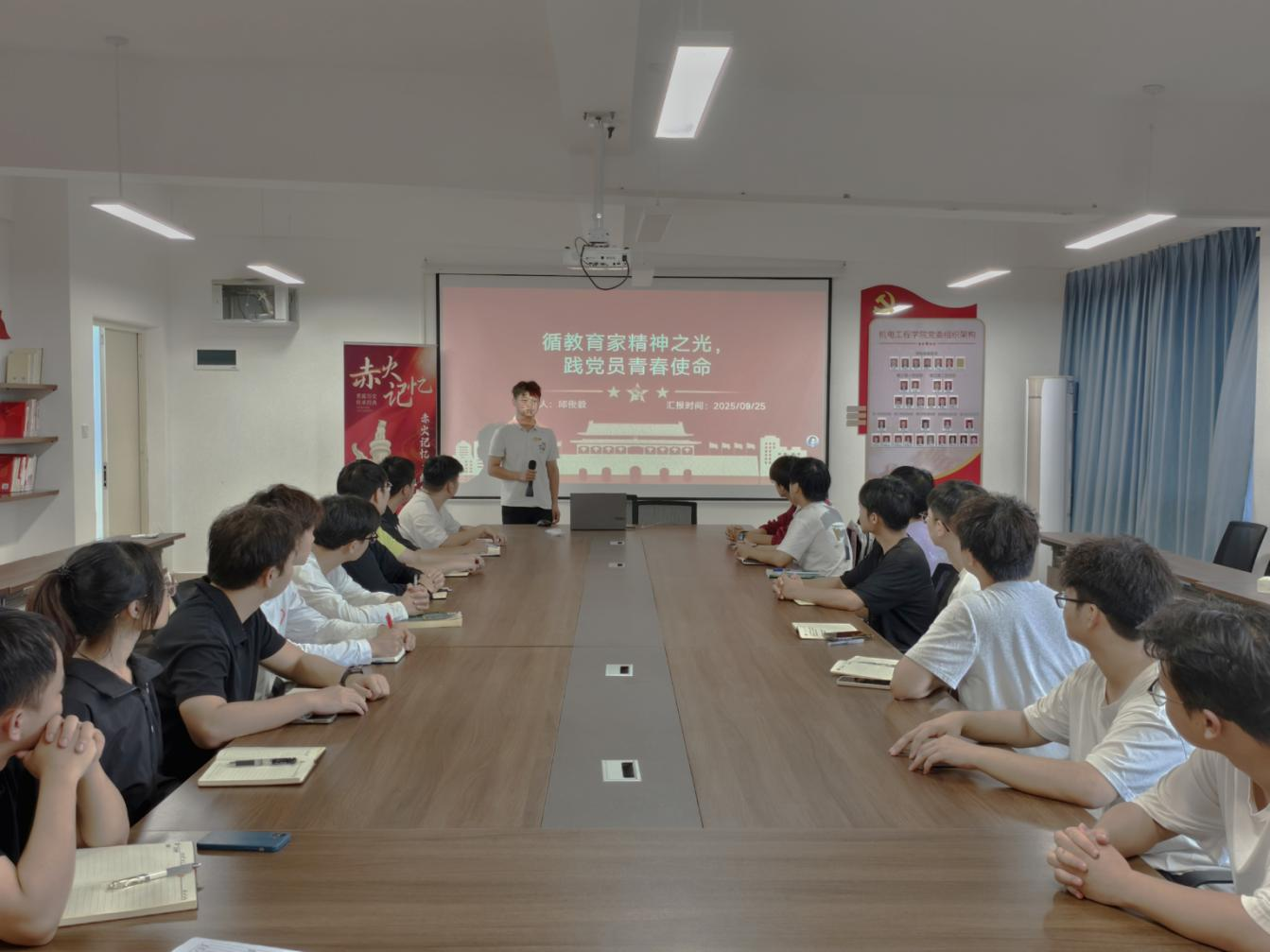 9月25日中午,机电工程学院第五学生党支部在正心楼J706教室举办“循教育家精神之光,践党员青春使命”赤火系列读书会。党支部全体党员参会,邱老师担任主持人,围绕教师节弘扬教育家精神的核心主题,带领党员探讨教育家精神内涵,关联学生党员现实实践,凝聚青春担当力量。