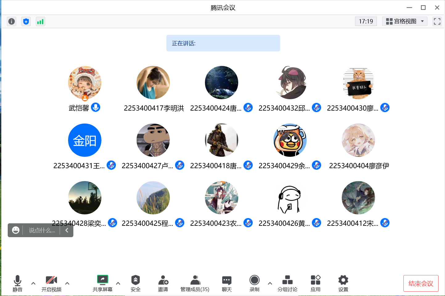此外,班主任也和同学们说明了线上课程学习期间需要注意的问题,提高线上课程学习过程中的重视程度,及时对任课教师课堂上提出的问题予以应答和反馈,课下遇到的问题及时联系任课教师解决,对已经结课的课程要合理安排时间复习和整理,关注教务的相关通知以免错过考试事宜。班长农俊稔也适时补充了未来几天的课程及考试安排情况,提醒同学们随时关注通知。