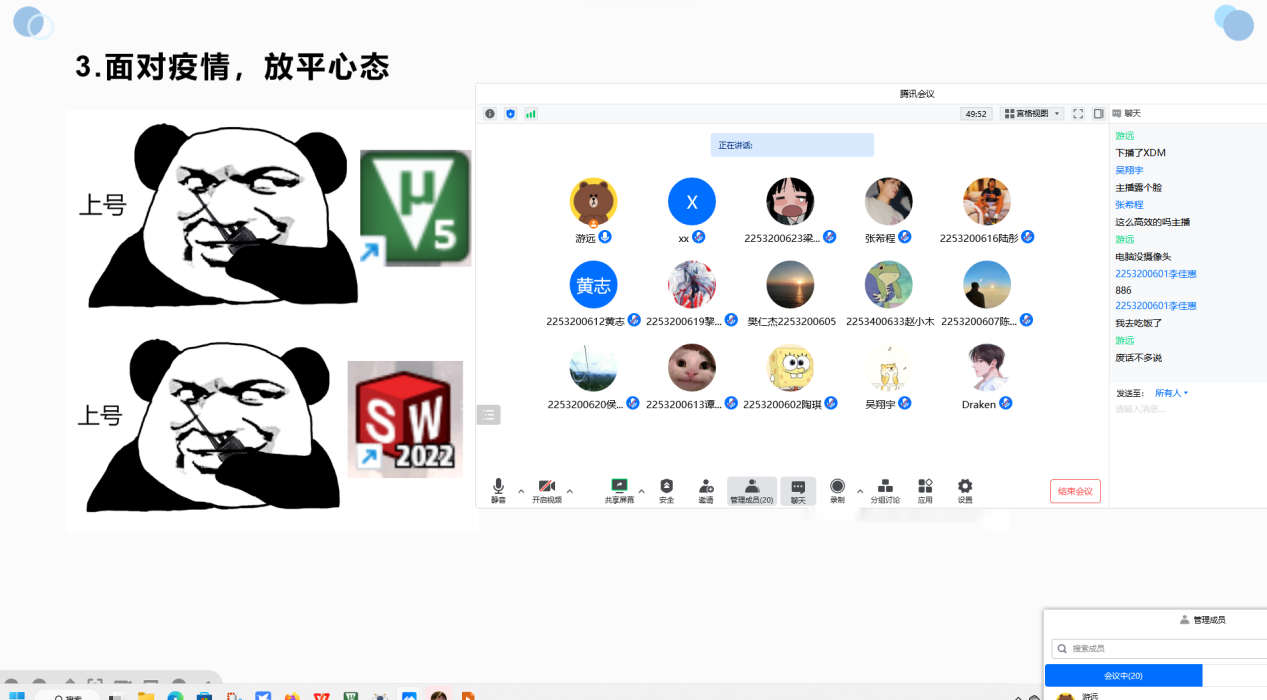 最后,游远老师表示,我们要以平和的心态面对疫情,利用好这段时间充实自己,一定要以自身安全为首要,切记不偷跑出校园,遵守校园规则,不给疫情防控工作“添堵” 。