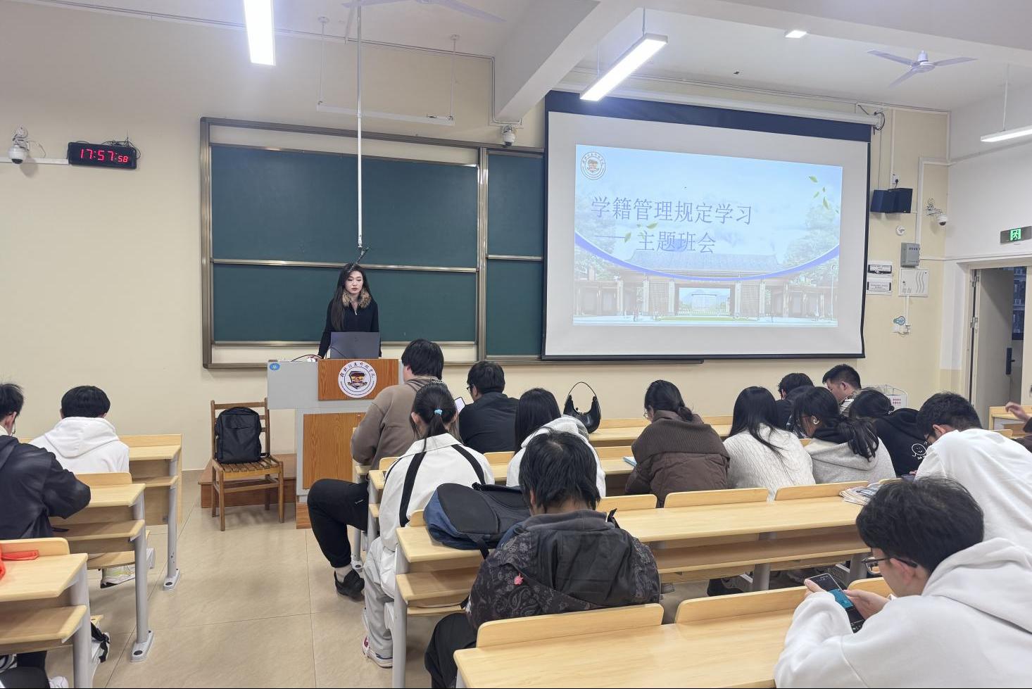 学习环节,各班主要采取辅导员解读、班干领学、案例分析与互动答疑相结合的形式展开。辅导员老师首先对《pp电子模拟器网站学生学籍管理规定》的核心内容进行了梳理与精讲,重点涵盖了入学与注册、考核与成绩记载、转专业与转学、休学与复学、留级与退学、毕业与结业等关键条款。同时,对学业预警机制、考试纪律与违纪处分办法、学分制要求、选修课规定、实践教学环节管理、奖学金评定及推免政策等学业相关制度进行了详细说明。