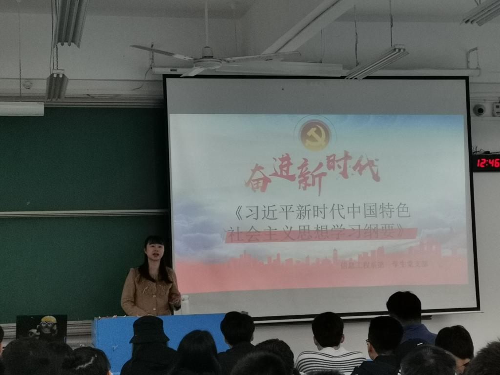 为把学习贯彻习近平新时代中国特色社会主义思想进一步引向深入,4月13日,信息工程系于31102组织全体党员学习《习近平新时代中国特色社会主义思想学习纲要》。本次会议由信息工程系第一学生党支部书记廖星男主持,信息工程系第一、第二、第三党支部全体同志参加。