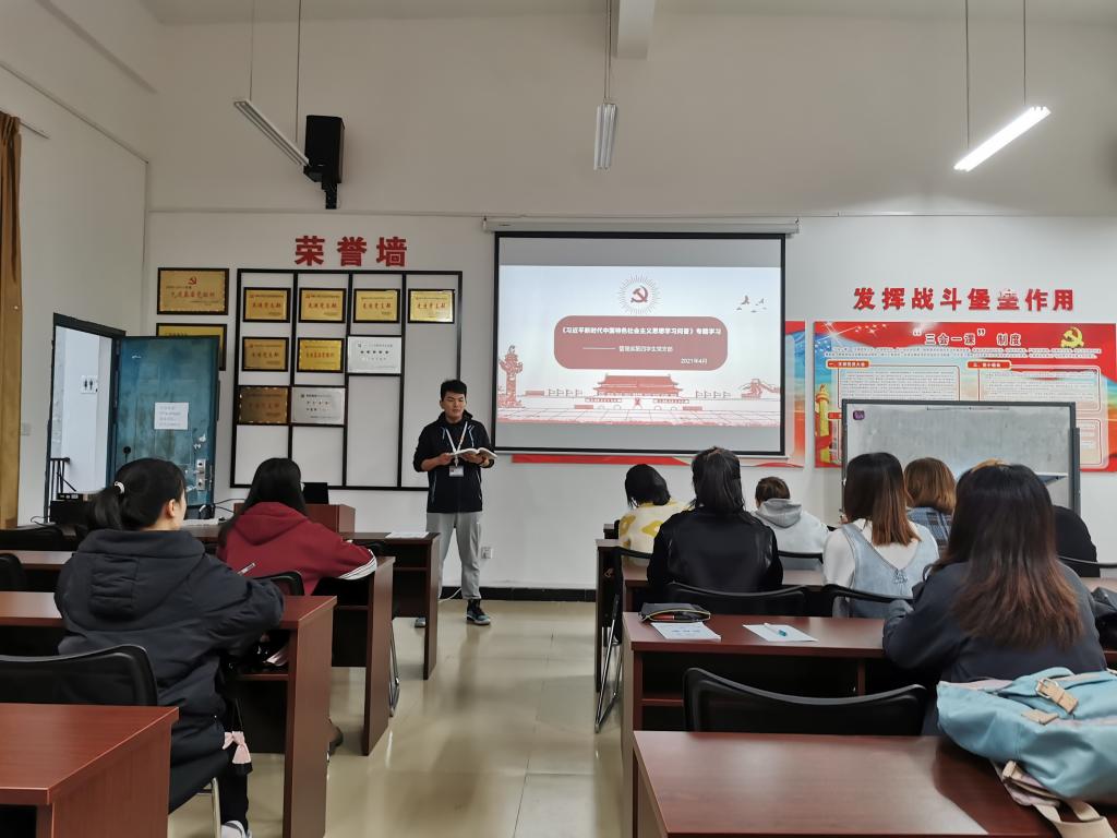 为深入学习贯彻习近平新时代中国特色社会主义思想,结合党史学习教育,4月12日由管理系党总支主办、第四学生党支部承办的《习近平新时代中国特色社会主义思想学习问答》专题学习在11501教室召开,本次学习由管理系第四学生党支部书记徐冉老师领学,全体师生党员参加。