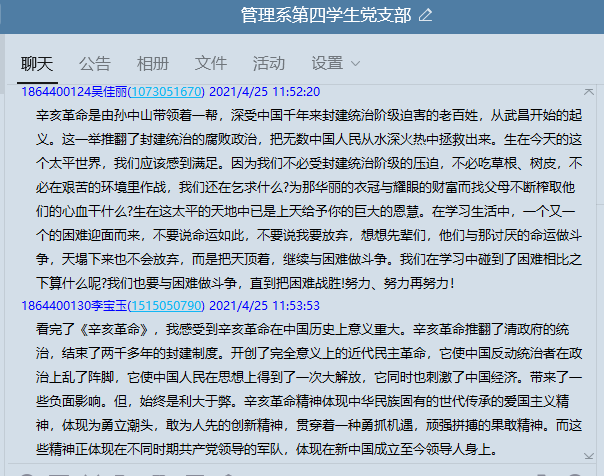 为深入学习党的百年历史,铭记革命先烈精神。4月25日由管理系党总支主办,第四学生党支部承办的《辛亥革命》主题观影活动,通过线上观看形式召开。全体师生党员参与观看。