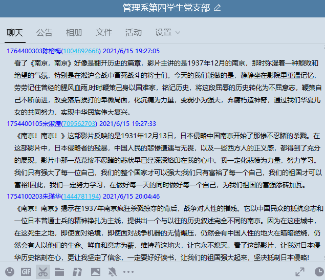 为深入学习贯彻新时代党史教育,铭记革命先烈历史。6月15日,由管理系党总支主办,第四学生党支部承办的《南京!南京!》微观影活动于线上开展。