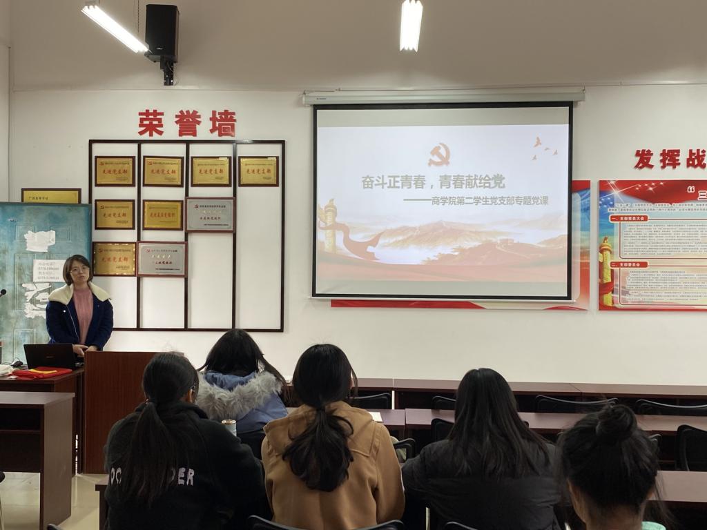 为加强全体党员理想信念教育,11月24日,商学院党总支组织开展“奋斗正青春,青春献给党”主题党课,此次党课由商学院第二学生党支部书记肖玲主讲,商学院学生党员、“头雁计划”学员参加学习。