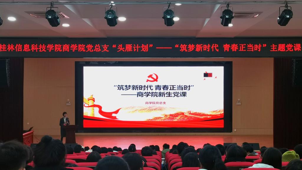 11月9日晚上,商学院党总支“头雁计划”开班仪式暨第一期“筑梦新时代 青春正当时”主题党课在51206报告厅顺利举行,商学院2021年全体新生、70期入党积极分子、“头雁计划”一期学员参与活动。大会由商学院组织员肖玲老师主持,商学院党总支书记、副院长赵奕作为主讲人。