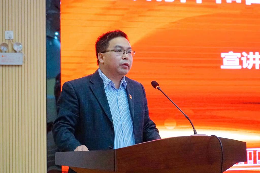 12月17日,pp电子在51206报告厅召开学习贯彻党的十九届六中全会精神和自治区第十二次党代会精神宣讲会。自治区党委教育工委特聘专家、桂林电子科技大学党委书记唐平秋在会上作传达宣讲,学校领导甘勇、唐步洲、陈智勇、宋海军、陈昱州、李飞、韩剑,党委委员王南萍出席会议,全体中层管理人员、各基层党组织书记、辅导员、马克思主义学院等单位师生党员共180余人参加会议。会议由党委书记甘勇主持。