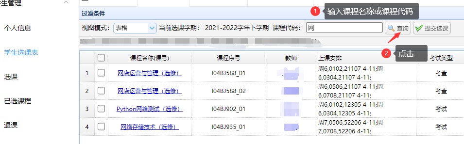 (2)选课系统开放时段内,请登录教务系统,点击选课,在课程代码对话框中,直接输入课程序号,再点查询,进行快速查找,从查找出的课程列表找到相应的课程序号,进行勾选后,再点提交选课。