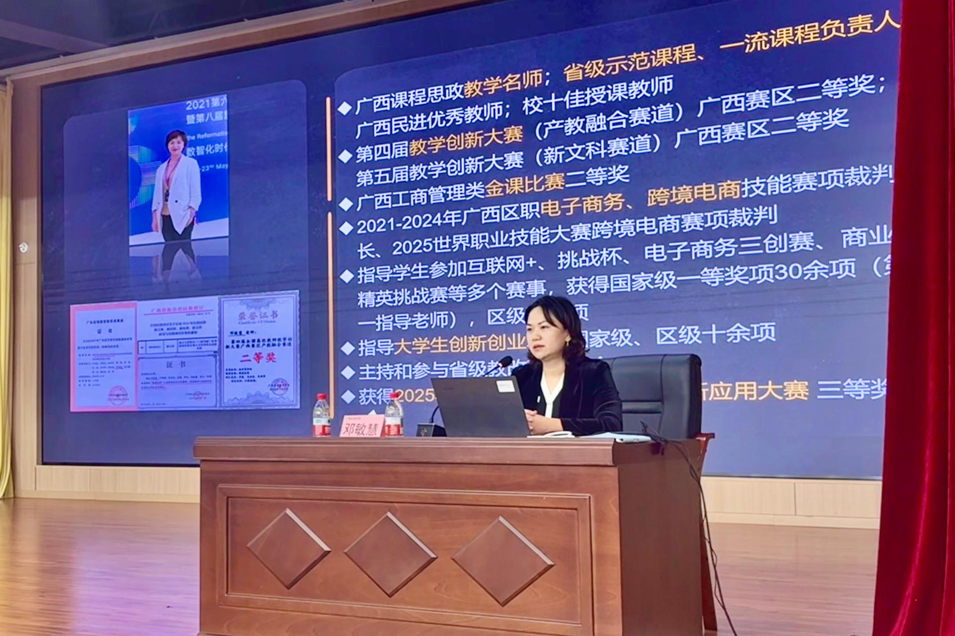 邓敏慧副教授聚焦商科课程创新,分享了“AI赋能跨境电商课程”的教学设计经验。她现场演示了多种AI工具在学情分析、资源建设、虚拟实训与智能评价等方面的具体应用,强调以“AI+项目”驱动,构建“课前导、课中练、课后拓”的全流程混合式教学模式,有效提升学生的岗位胜任力与创新实践能力。