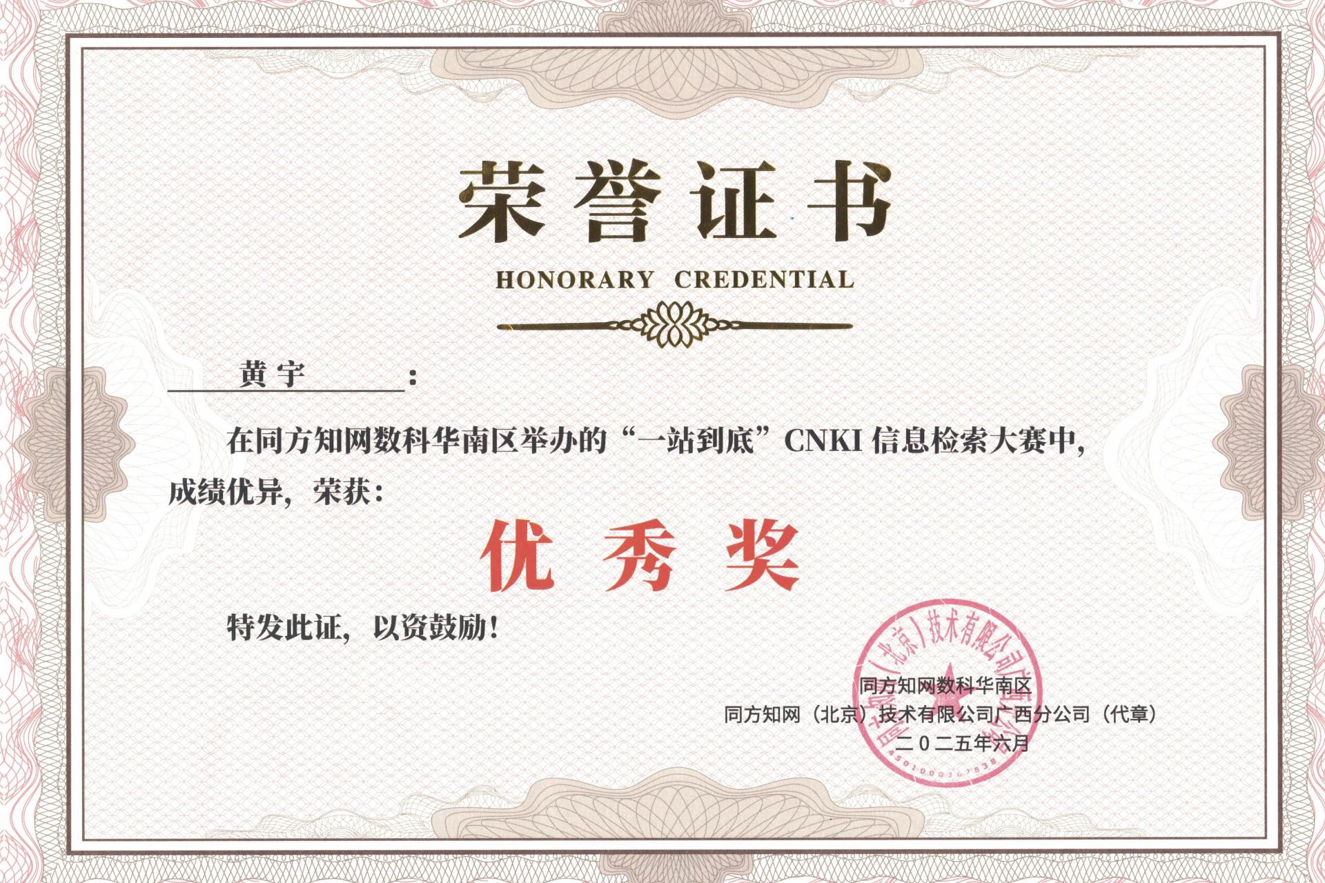 近日,2025年CNKI读书月系列活动“一站到底”CNKI信息检索大赛圆满结束,pp电子学生踊跃参加,其中黄宇同学荣获“优秀奖”。