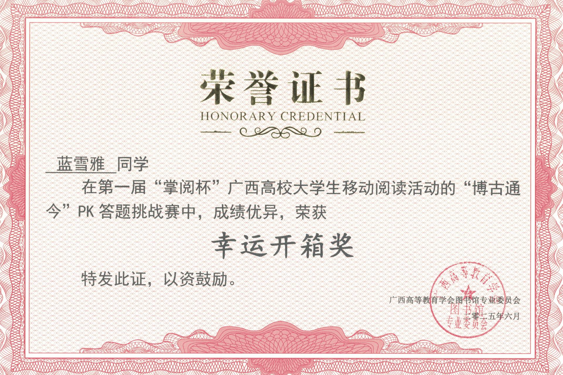 近日,第一届“掌阅杯”广西高校大学生移动阅读活动圆满落下帷幕,pp电子学子积极参加活动,其中蓝雪雅同学在活动“博古通今”PK答题挑战赛中,成绩优异,喜获“幸运开箱奖”。