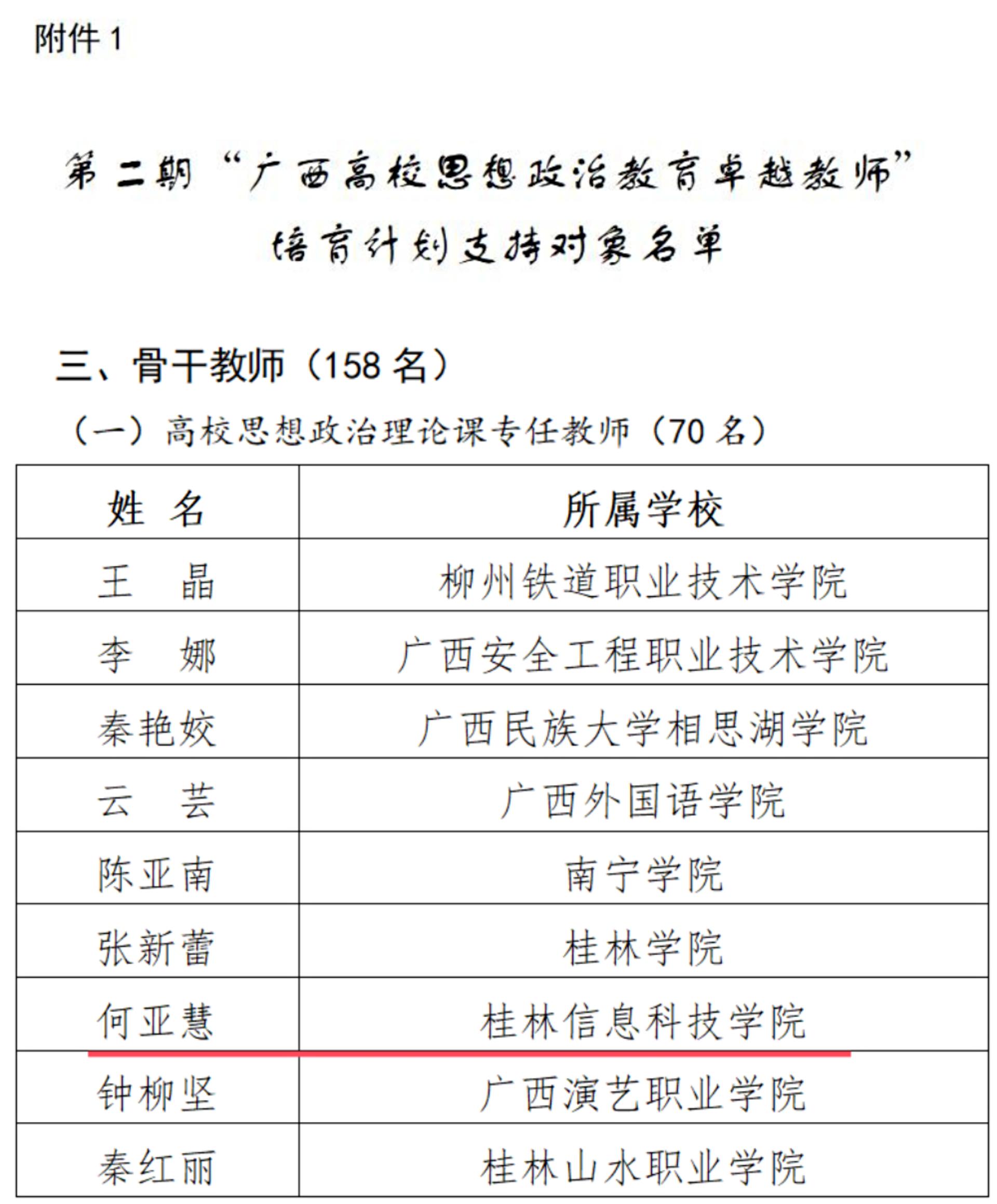 近日,自治区教育厅公布了第二期“广西高校思想政治教育卓越教师”培育计划支持对象“中青年骨干教师”名单,pp电子马克思主义学院教师何亚慧成功入选。