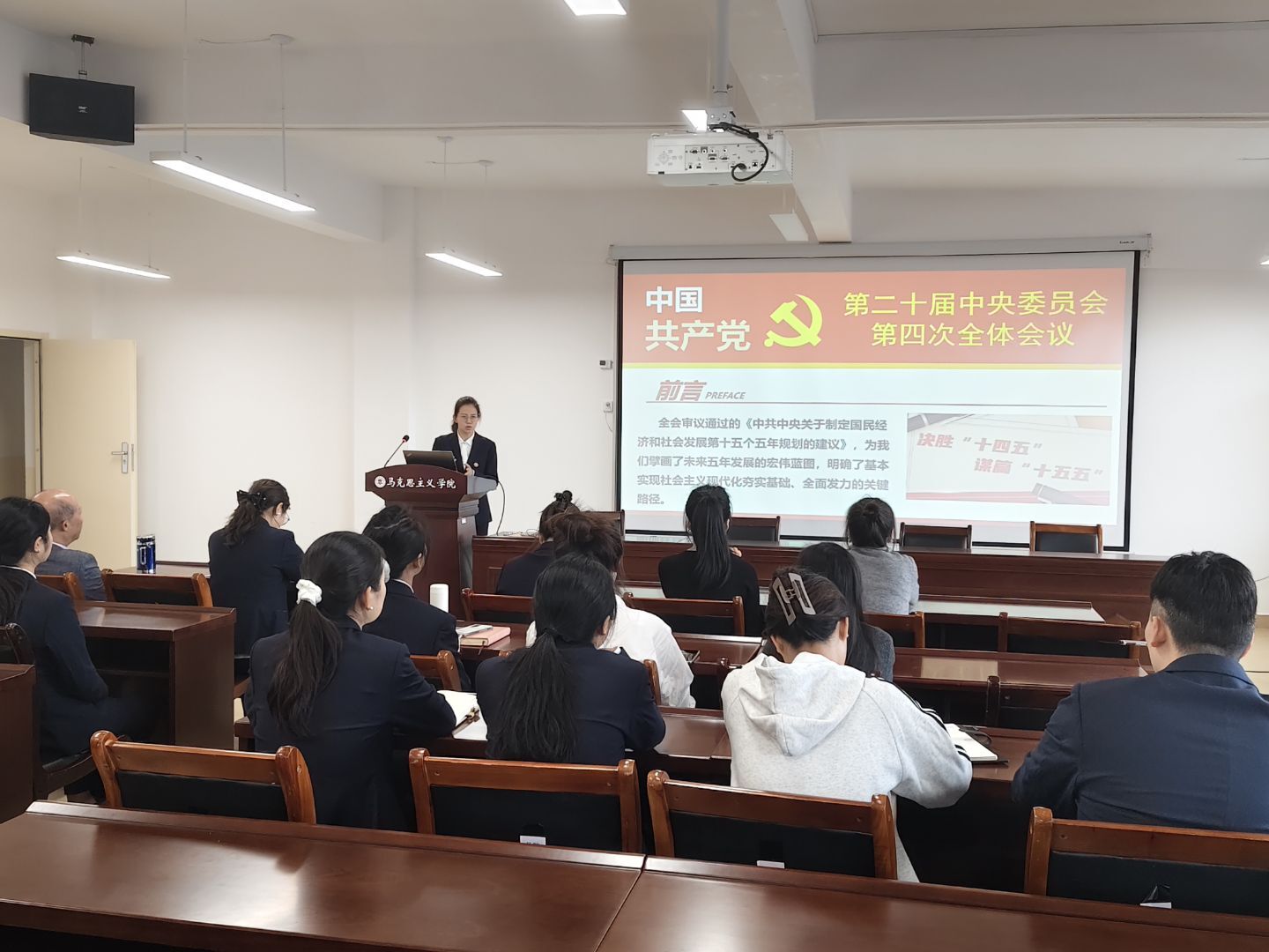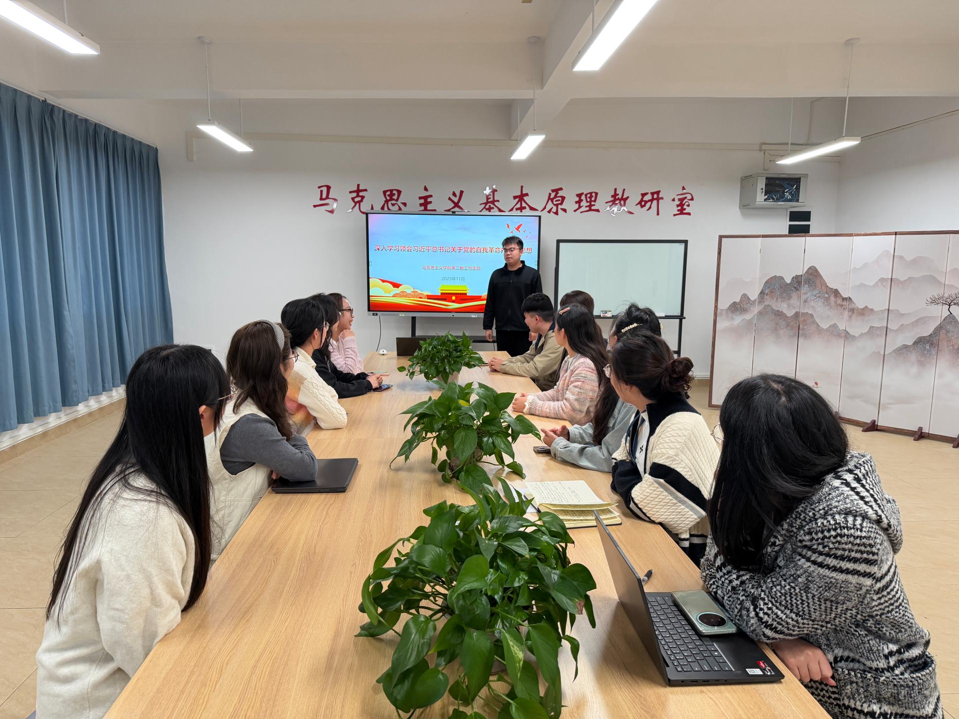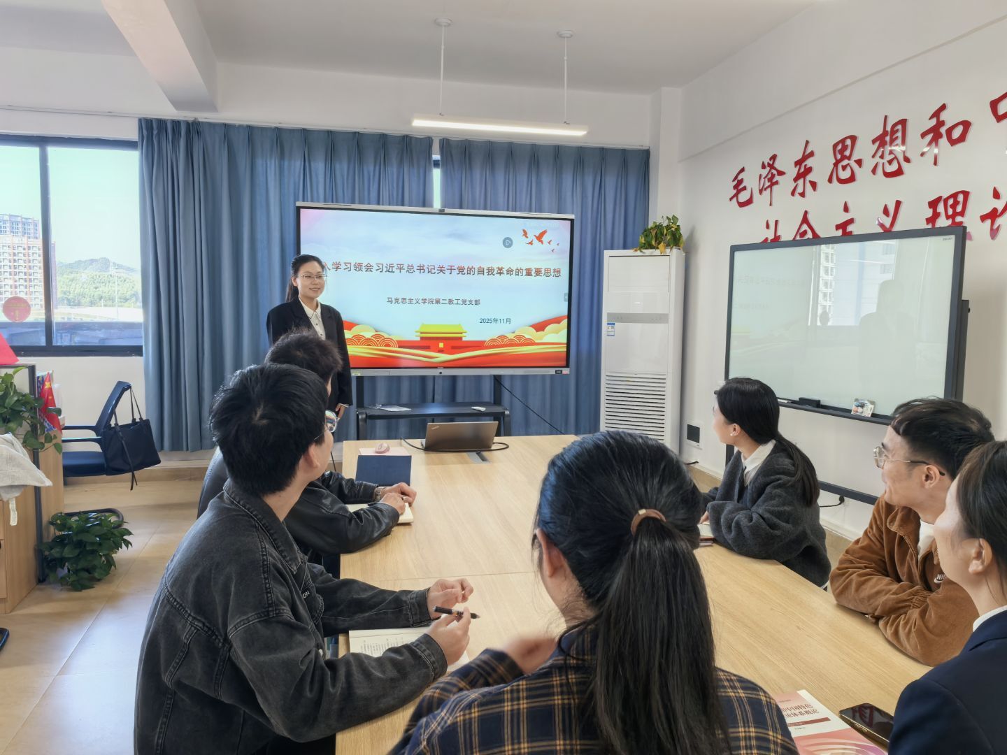 为深入学习贯彻党的二十届四中全会精神,进一步提升党员教师的理论素养与政治能力,推动党的创新理论深度融入思政课教学,11月13日,马克思主义学院第二教工党支部书记何亚慧以“深悟党的二十届四中全会精神实质”为主题,在G605会议室为支部全体党员讲授专题党课。