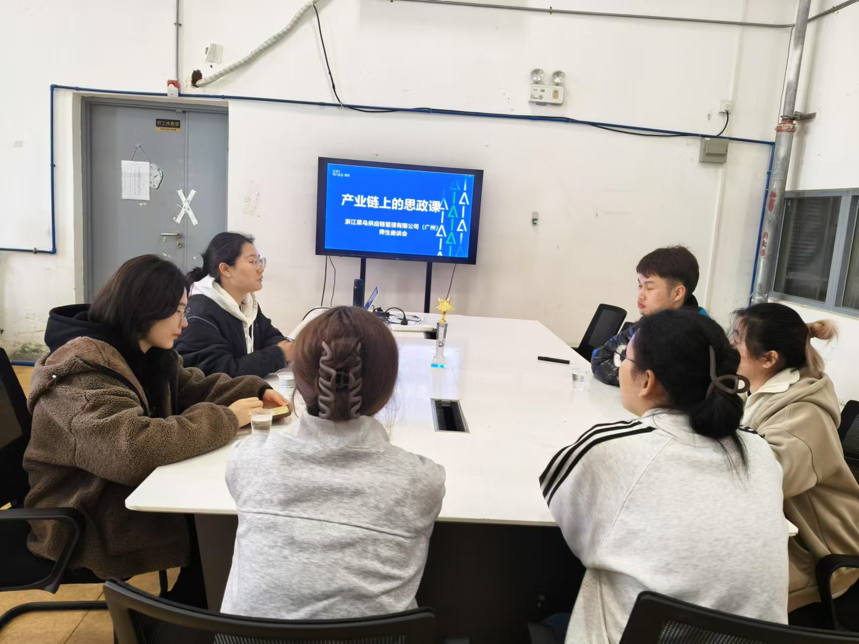 与企业负责人深入交流,全面了解学生实习表现,并针对个体特点制定差异化培养方案。在师生座谈会上,学生们积极分享实践收获并提出职业发展困惑。两位教师立足企业实际案例,以价值引领和问题导向为切入点,深入剖析行业发展趋势与职业精神内涵,并围绕实习中的具体问题,以“职业规划与责任担当”为主题,为学生讲授了一堂生动的产业链思政课,有效引导学生明确发展方向。