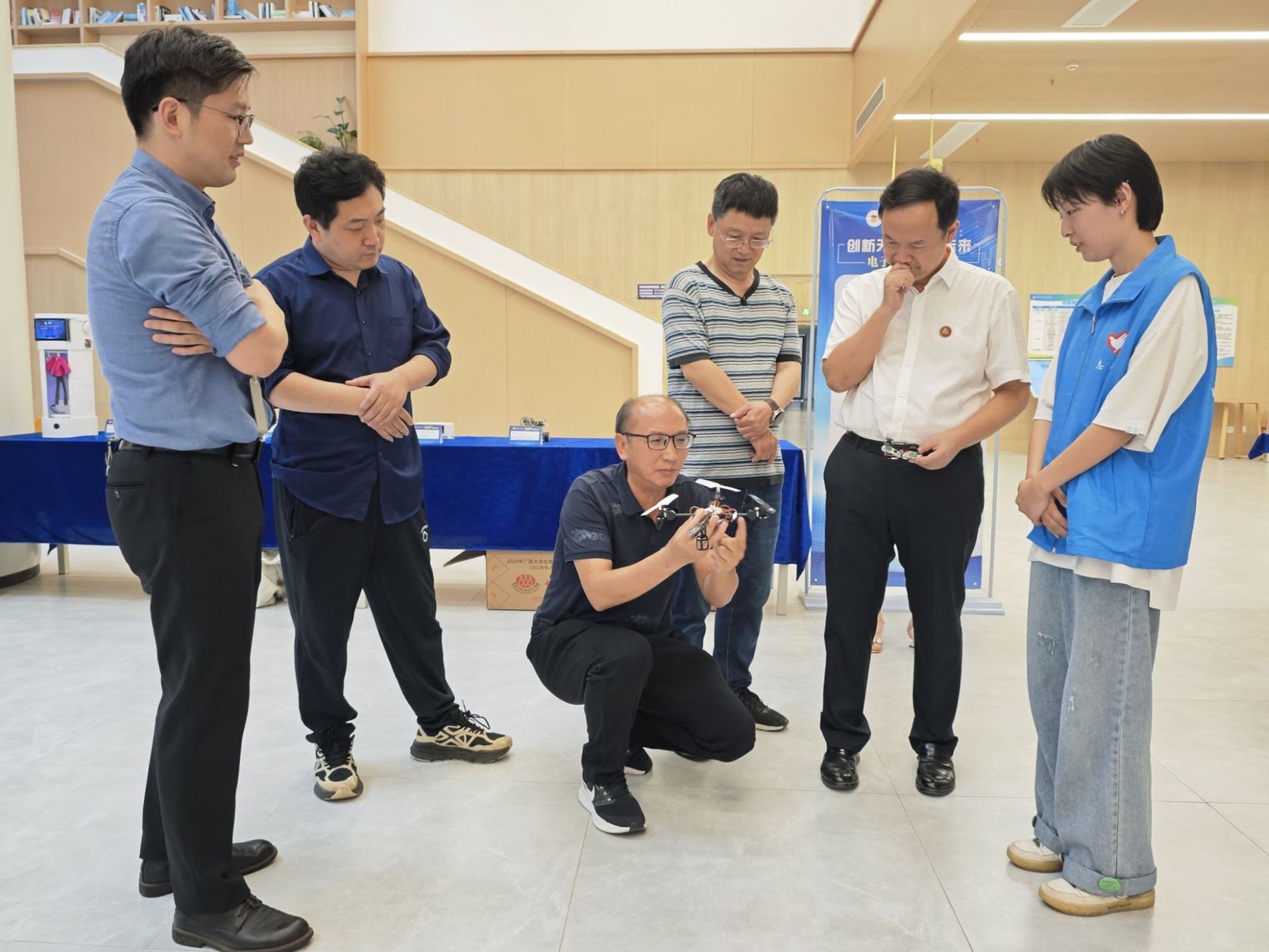 罗欣董事长认真观摩了电子设计作品,听取了电子创新基地学生代表的作品讲解,并与学生自制作品“三子棋游戏装置”和“基于STM32的小型无人机”进行了现场互动。