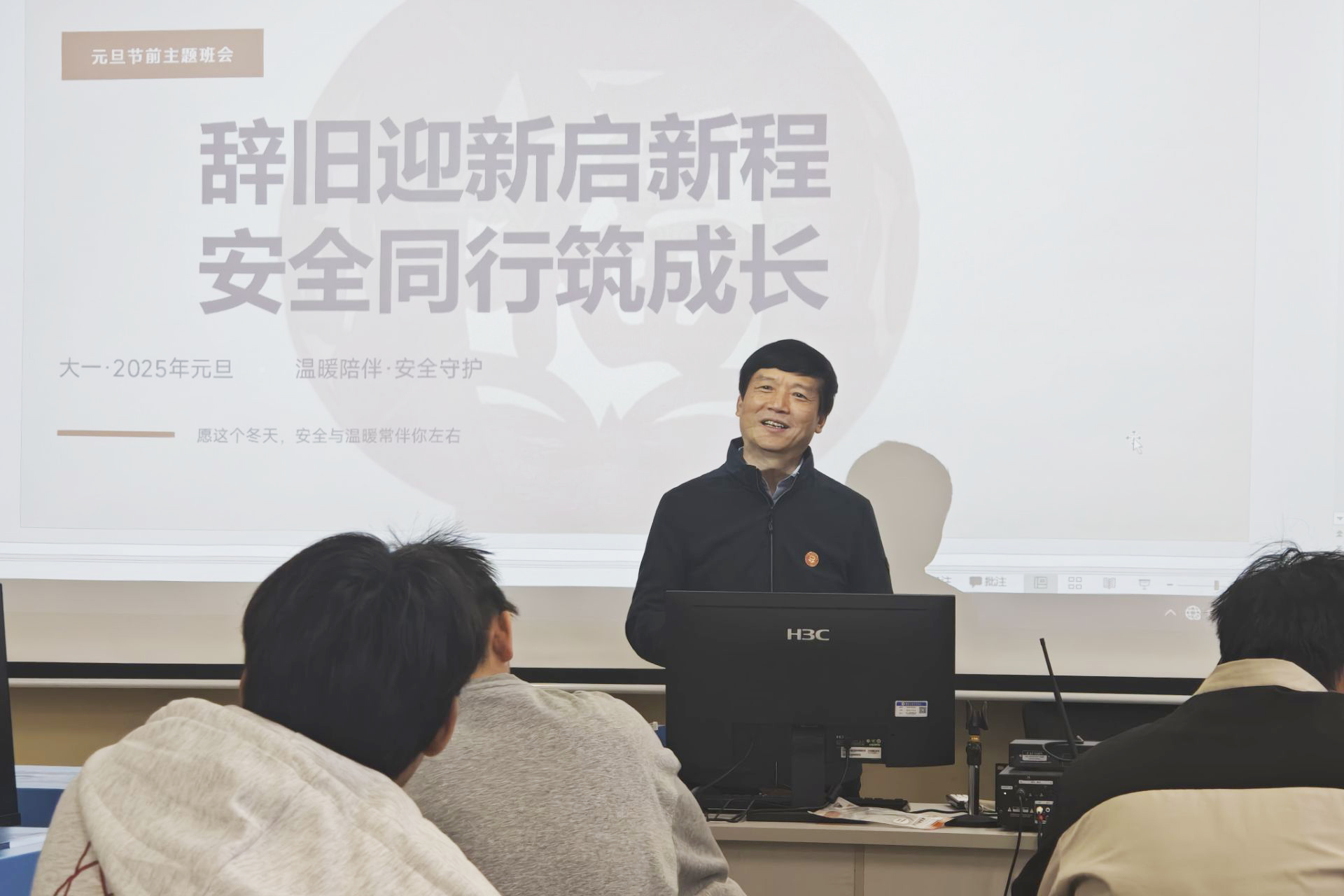 2025年12月31日,pp电子电子工程学院2025级电子信息工程1班“辞旧迎新启新程,安全同行筑成长”主题班会在敦明楼A212召开。校长解庆林亲临现场,与同学们亲切交流,并送上真挚的新年祝福。班主任许玲老师主持班会。