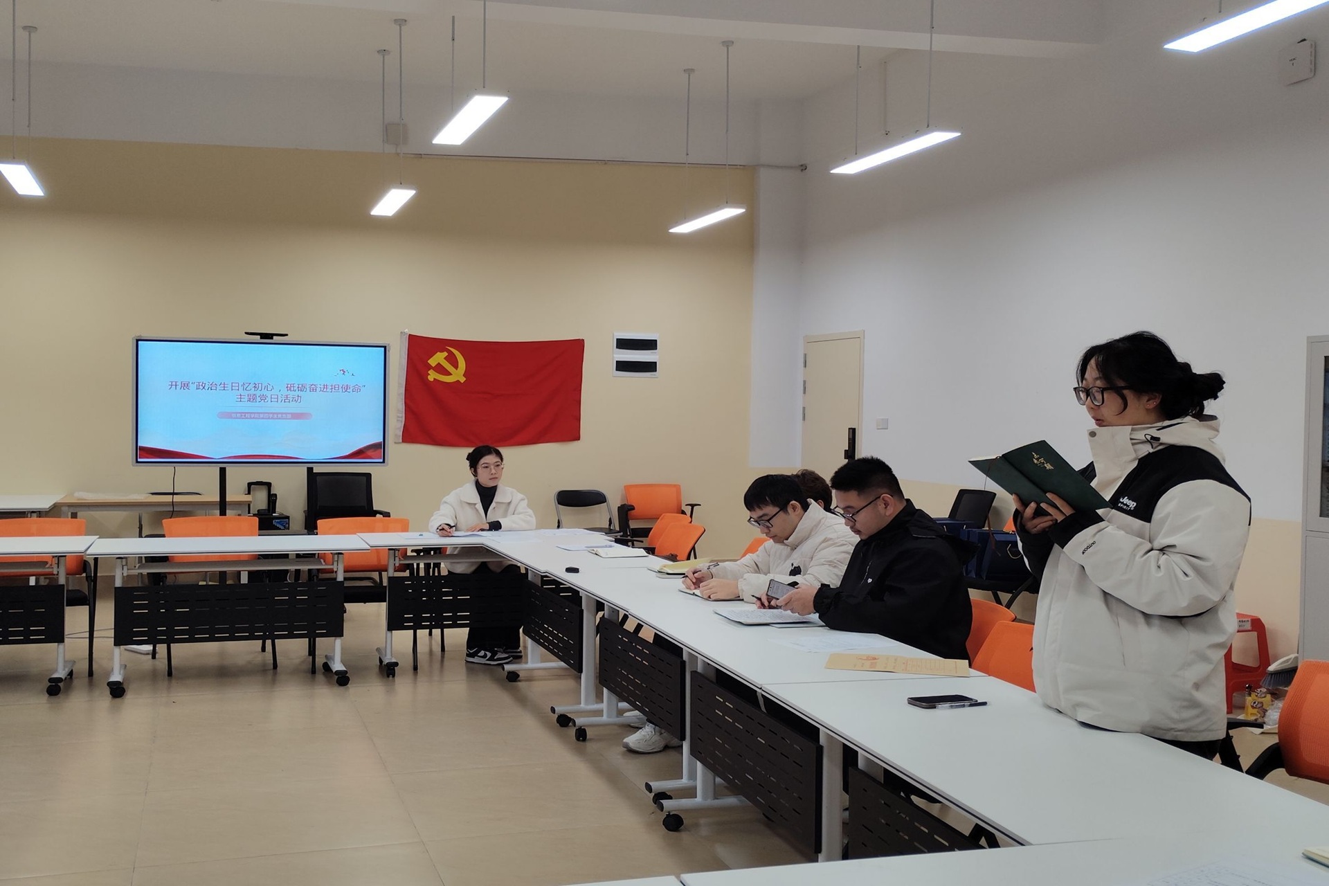 活动最后,全体党员面向鲜红的党旗,庄严地重温入党誓词。“我志愿加入中国共产党……”铿锵有力的誓言在会场内回荡,这不仅是对入党初心的深刻回溯与铭记,更是对理想信念的再次淬炼与升华。通过重温誓词,全体党员进一步强化了身份认同感和归属感,切实增强了为党育人、为国育才,以及推动学院和学校事业发展的使命感与责任感。