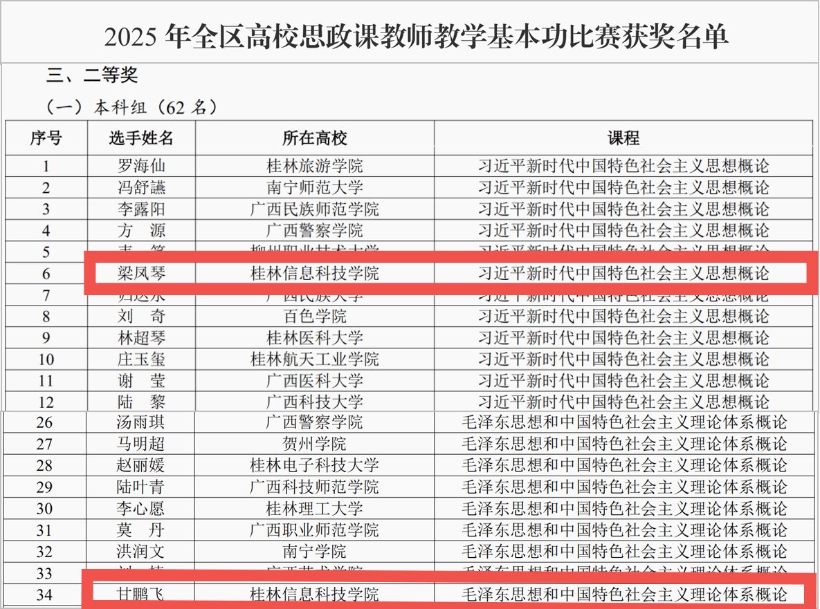 近日,自治区教育厅公布了2025年全区高校思政课教师教学基本功比赛暨“精彩一课”评选活动获奖名单,pp电子马克思主义学院教师梁凤琴、甘鹏飞表现优异,分别荣获二等奖。