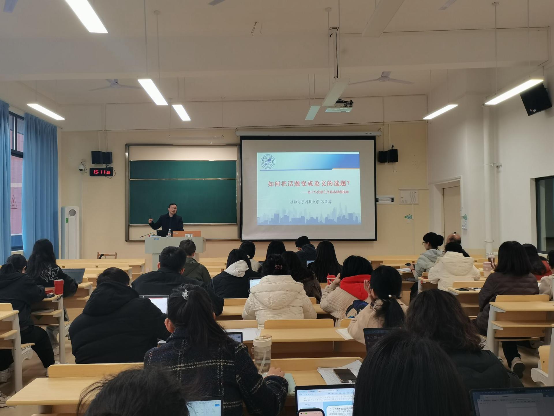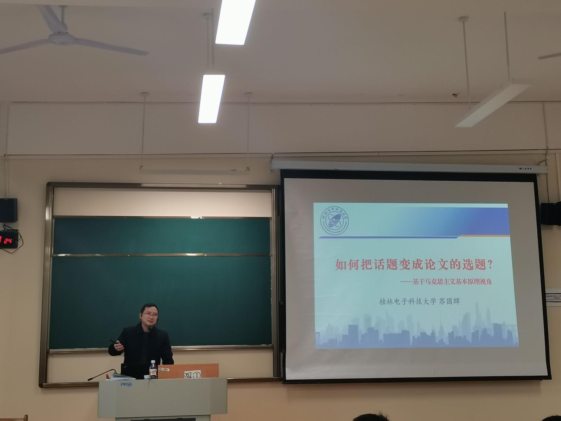 12 月 6 日,马克思主义学院邀请桂林电子科技大学的苏国辉教授,为学院全体教师举办了一场以《如何把话题变成论文的选题?——基于马克思主义基本原理视角》为题的学术讲座。