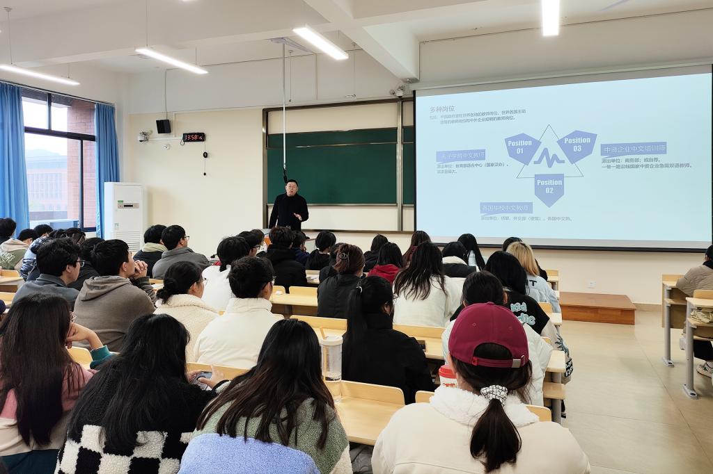 在讲座中,王家年院长以“专业与职业的多维认知”为主题,从学院对英语专业的培养目标、就业趋势、国际中文教师发展等五个方面进行了解读。王家年院长结合英语专业的特点,引导学生明确职业目标。此后,他结合自己担任国家汉办孔子学院中方院长的经历,详细介绍了成为国际中文教师的前期准备、申请流程、待遇和培训过程,并建议同学们合理规划自己的未来发展道路。最后,各年级的英语专业学生就讲座中的英语专业学生就业发展趋势、就业岗位准备等主题提出了问题,王家年院长和相关专业教师一一给予了指导意见,帮助英语专业学生合理规划未来就业。