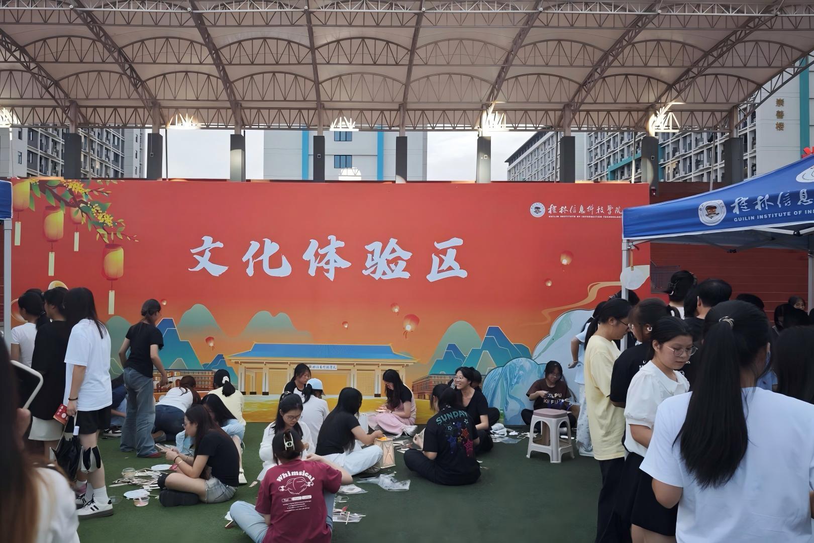 文化体验区俨然一座流动的传统文化博物馆。同学们在冰皮月饼DIY工坊揉捻团圆意,在竹篾花灯教室里扎制星河梦,更在非遗漆扇制作中感受"指尖生花"的匠心传承。"漓水映月·河灯寄愿"环节尤为动人,学子们将"愿家人安康""祝祖国强盛"的心声郑重书于灯上,当数百盏河灯从手中次第绽放,烛光摇曳的河面仿佛化作星河流转的夜空,小家温情与大国情怀在粼粼波光中交融升华。