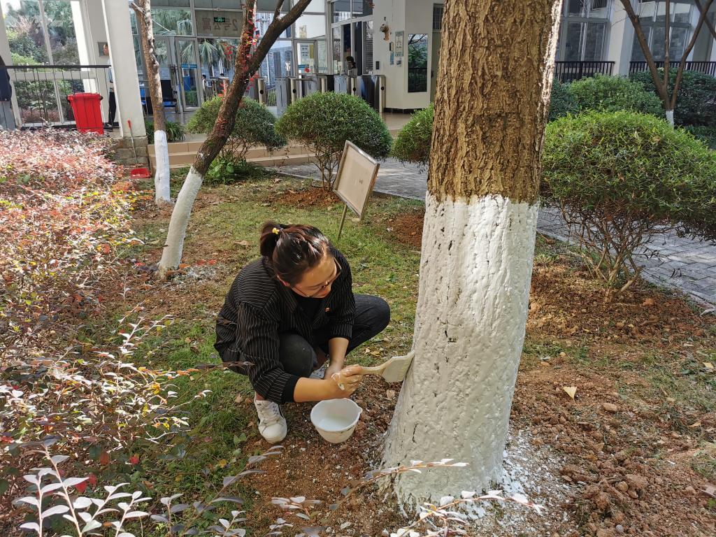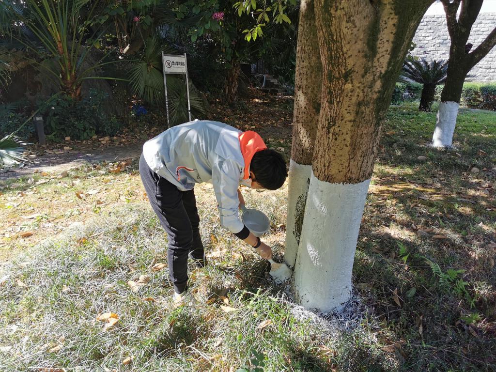 参加志愿服务的师生党员在物业中心老师及绿化师傅的指导下进行分组,大家自行分组利用木刷、竹片、涂白剂等工具对责任区内的树木进行涂白工作,此次设计系党总支的党员同志完成了从三号公寓到后山篮球场到二号公寓范围内的60余棵大树涂白工作。