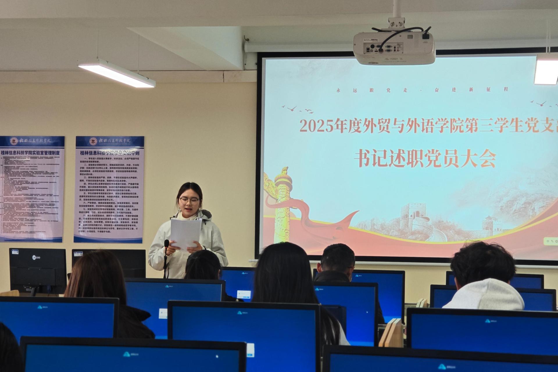 为深入贯彻落实全面从严治党要求,切实加强学校党委对基层党组织的联系指导,12月25日下午,外贸与外语学院第三学生党支部在文汇楼召开党员大会,学校副校长刘跃峰同志出席第三学生党支部党员大会并指导工作。
