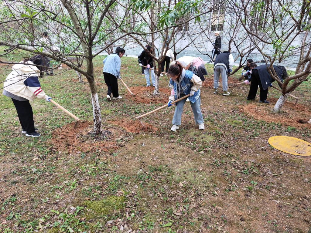 此次志愿服务的活动内容是为树木施肥,同学们一下课就来到了活动区域给树木进行施肥。后勤人员给同学们分发了施肥工具,给大家安排了工作并讲解了施肥方法。同学们分成了两组,一组挖土、埋土,一组施肥,同学们个个干劲十足,虽然很累,但是同学们的脸上洋溢着笑容。